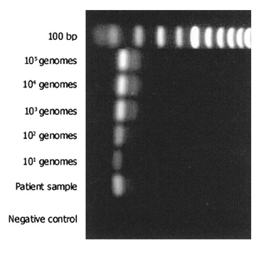 been published using this technique. PCR is essentially an in vitro replication of bacterial DNA replication, stripped of all inessential components (Fig. 1). The necessary ingredients are the DNA template (i.e., from a pathogen residing in a biopsy specimen), a pair of 20 to 30 nucleotide oligonucleotide primers specific for the targeted DNA sequence (i.e., a sequence from a viral genome), nucleotide triphosphates (the building blocks for DNA), a thermostable DNA polymerase to catalyze replication, appropriate salts and buffers, and a thermal cycling machine. Once combined, the thermal cycler creates conditions for the three steps of PCR. Each step usually takes between 30 seconds and 2 minutes. The process begins with the denaturation step (typically at approximately 94°C), which separates the double-stranded template DNA into single strands. The temperature is then lowered to the annealing temperature (specific to each pair of primers, typically 45°C to 65°C), which allows the primers to optimally bind to their target sequences. After annealing, the temperature is elevated to an optimal temperature for thermostable DNA polymerase activity (typically between 72°C and 74°C). DNA polymerases capable of functioning at such high temperatures are isolated from thermophilic bacteria (such as those living in geothermal pools). At this temperature, the polymerase catalyzes synthesis of DNA complementary to the template at a rate of approximately 1000 bases per minute; thus a 500 base pair (bp) target may require 30 seconds of extension time. After extension, the temperature is again raised to denature the template DNA from the newly formed complementary strand of DNA. Thus, at the end of the first cycle, the number of target DNA strands has doubled. Both the original template and the new complement strand can then become templates for another round of amplification. PCR is an exponential process; theoretically, after 35 cycles (standard for many protocols), more than 35 billion copies of the original template DNA will have been synthesized. Starting with a single virion (whose DNA weighs 1.6 × 10−16 g), after 35 cycles nearly 20 ng (2.0 × 10−8 g) of 500 bp product will be produced. This quantity of DNA is adequate for further analysis. The most commonly used method for detection of the PCR product is electrophoresis in an ethidium bromide-stained agarose gel (Fig. 2). The limit of detection in such a gel is approximately 10 ng of double-stranded DNA. Given the calculations above, PCR should theoretically be able to detect a single genome in a given sample. However, because of imperfect amplification efficiency, maximal sensitivity is generally on the order of 10 genomes. PCR products may also be detected in other ways, using more sensitive dyes such as fluorescent SYBR Green®. This dye may be used in a special variant of PCR (real-time PCR), which allows quantification of product (see later). Sensitivity for detection of PCR products can be improved by use of radioactivity and autoradiography, but these techniques are seldom applied in clinical practice. Although detection of a band of the correct size on electrophoresis is generally considered indicative of a positive result, PCR products may be more specifically identified in a number of ways. Restriction endonucleases can digest the PCR product into sequence-specific fragments, the pattern of which, on electrophoresis, forms a distinct fingerprint. Alternatively, hybridization methods allow identification by binding the PCR product to a nylon or nitrocellulose filter paper and then incubating the nylon with a labeled DNA or RNA probe that binds to a specific DNA sequence. The gold standard for demonstration of a specific identity for a PCR product is DNA sequencing, which can be performed either directly from the PCR product or after cloning of that fragment into a plasmid vector. |