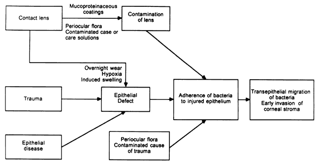 The early pathogenesis of bacterial keratitis in the contact lens wearer is described in Figure 3. When a contact lens is placed on the eye, it is rapidly coated with mucoproteinaceous deposits. With increased wear, the lens becomes increasingly susceptible to adherence by bacteria to which it becomes exposed, either while stored in contaminated lens-care solutions or when exposed to periocular bacterial flora. In a non—contact lens wearer, the odds of infection are low because two infrequent events must occur simultaneously: (1) the localization of pathogenic organisms on the eye; and (2) the development of an epithelial defect. In a patient wearing a contaminated contact lens, pathogenic organisms are always present and infection can occur whenever an epithelial defect develops. Thus, the contaminated contact lens is a “time bomb” with the potential to cause a case of ulcerative keratitis. Once epithelial receptors become exposed, bacteria from the contact lens reach the cornea and become adherent to the injured epithelium. The bacteria then penetrate the deeper layers of the cornea, replicate, and incite an inflammatory response, which is seen clinically as ulcerative keratitis. |