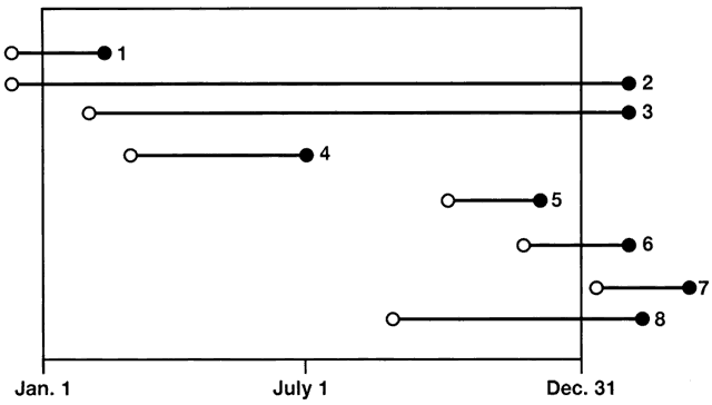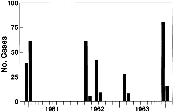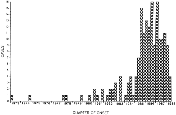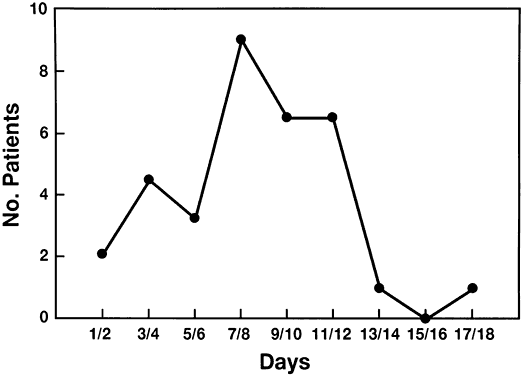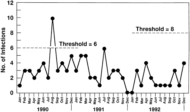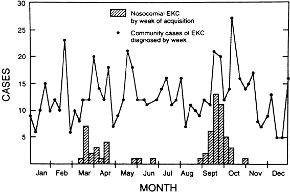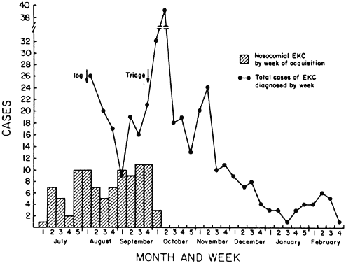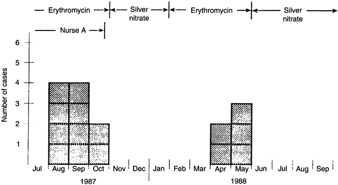 Ocular infections remain a global concern, even in developed nations, and are an individual as well as a community problem. For example, Americans contract an average of three ocular infectious diseases per year, with annual costs of more than $17 billion and of nearly $2 billion in lost work or school days.12 The worldwide frequency of ocular infections is uncertain. One surrogate measure is the number of topical ophthalmic anti-infective preparations prescribed, which runs into the hundreds of thousands each year (see http://ims-america.com, http://www.druginfonet.com, and http://www.fda.gov). Improved surveillance of ocular disease could better determine its frequency and distribution worldwide. EPIDEMIC OCULAR INFECTION An epidemic curve is a histogram showing the number of cases plotted over time. Sharp increases in disease frequency often reflect the exposure of several people to a point source of contamination. The downward slope may be skewed by waves of secondary cases from person-to-person transmission of a communicable infection. For example, the epidemic curve of an outbreak of adenovirus conjunctivitis often begins like that of a commonvehicle, single-exposure epidemic in which there is a sharp, initial rise in the number of cases with a subsequent, gradual fall. There are often one or more additional peaks and troughs as the virus continues to spread by serial and interpersonal propagation, superimposing in two or more epidemic curves over endemic, sporadic cases (Fig. 3). Each infectious disease is characterized by an incubation period (the interval between exposure to the infective agent and the onset of illness). During incubation, the pathogen multiplies to the threshold needed to produce symptoms in the host. The incubation period for an ocular infection such as adenovirus conjunctivitis varies among patients and produces a skewed curve along the time axis (Fig. 4). The downward slope is less steep than the upward slope because the incubation period is affected by factors such as inoculum size and host immunity. The date of symptom onset is usually obtained from the history of the patient taken at a subsequent date of diagnosis. Graphing the incubation periods of a common-vehicle epidemic approximates a lognormal distribution and represents the epidemic curve.13 The incubation period can also be estimated by the reciprocal of the incidence rate. Some ocular infections are so rare, such as conjunctivitis related to trichinosis or uveitis due to brucellosis, that even one case can be a sentinel of an emerging problem. Such outbreaks due to a common reservoir can seem to erupt unexpectedly within a population (Fig. 5). However, most epidemics occurring from a shared source or practice develop from a background of sporadic infections. Knowing the baseline rate of disease is necessary to identify an outbreak. Surveillance information on a disease's endemic level allows the epidemiologist to calculate the threshold for recognizing a significant increase. An example of threshold testing is the periodic monitoring of the number of cases of nosocomial conjunctivitis (Fig. 6). TIME, PLACE, AND PERSON An epidemic occurs when a disease clusters at the same time and in the same place. In addition to diseases spread by interpersonal contact, outbreaks of infection can occur after ocular surgery. For example, an outbreak of endophthalmitis can begin from a bottle of reused intraocular irrigant, a contaminated lot of intraocular lenses, or a contaminated batch of corneal preservation media. Increased use of a surgical procedure can raise the number of infected cases, but epidemicity is obscured when the incidence is low and cases are widely distributed across the eye care profession. The rise in cataract surgery, the wearing of contact lens, and other widespread exposures probably contribute to hidden epidemics of microbial endophthalmitis and bacterial keratitis. Epidemics are easiest to recognize when abrupt changes in disease frequency affect many individuals in a population within a short time. The recognition of secular trends during long periods is more challenging.14 Epidemiologic transitions from one era to another can be broadly assessed (Table 4), but accurate determination of the public health importance of specific ocular infections can be difficult.