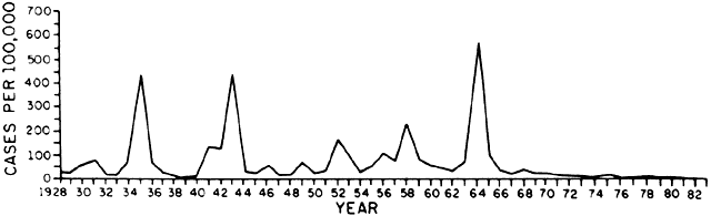 Identification of an epidemic requires recognition of new cases of a disease. An outbreak is often depicted as an epidemic curve, the histogram display of cases occurring during a period. However, the epidemiology of many infections is both endemic and epidemic. For example, before widespread immunization, rubella in the United States occurred by interpersonal spread among schoolchildren and older individuals. Superimposed on this endemic-level disease was a cycle of epidemics at 7-year intervals (Fig. 7). Conjunctivitis is very common during rubella, and epithelial keratitis occasionally occurs. The recognition, first made by an ophthalmologist,15 that rubella virus was a potent teratogen, further showed the epidemiologic importance of this common disease. The 1964-1965 epidemic produced a substantial human and economic burden, involving 12.5 million rubella cases; 20,000 infants were born with congenital rubella syndrome, including 3580 who were blind.16 It is mainly because of the success of the rubella vaccine that no more than 50 cases per year of congenital rubella syndrome have occurred in the United States since 1966. Implementation of a national immunization policy suppresses endemic infection and blunts epidemics. In the prevaccine era, mumps occurred in epidemic cycles of 3-to-5 years, and a large pool of cases resulted in occasional cases of dacryoadenitis, mumps keratitis (Fig. 8), and encephalitis. Because of the widespread use of live mumps vaccine after 1967, the occurrence of mumps has become rare, and mumps keratitis has essentially disappeared.