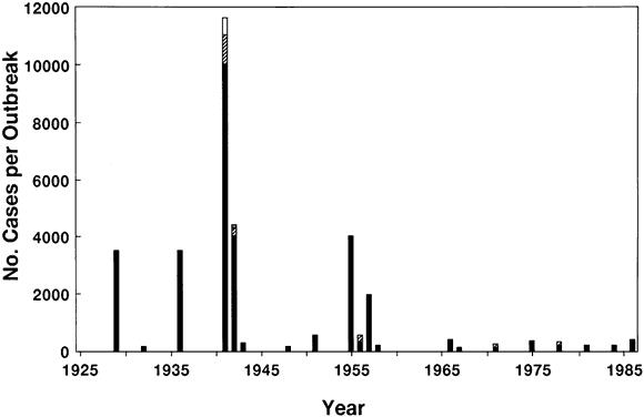 Gonococcal conjunctivitis develops in from 30% to 42% of newborns who are exposed to N. gonorrhoeae during delivery. Between 25% and 50% of neonates exposed to C. trachomatis during delivery acquire chlamydial conjunctivitis. The attack rate during a common-source outbreak in a newborn unit can exceed 10%. Seasonal variations in neonatal conjunctivitis correspond to fluctuations in maternal gonorrhea and chlamydiosis. Because the rate of adult gonorrhea peaks during late summer and fall in the United States, so does gonococcal neonatal conjunctivitis (Fig. 28). VARICELLA ZOSTER VIRUS DERMATOBLEPHARITIS Varicella zoster virus (VZV) outbreaks are common in closed communities such as schools, camps, and hospitals, where many nonimmunized children are exposed to an infected individual. VZV does not occur in an epidemic pattern, although a rising incidence is following the AIDS epidemic. Rare outbreaks of shingles, with an attack rate of 5% to 10%, have followed re-exposure to VZV. For chickenpox, secondary attack rates among susceptible household contacts is 70% to 90%. Chickenpox peaks in winter and early spring in the northern hemisphere; VZV has no seasonal variation. HERPES SIMPLEX VIRUS KERATITIS Outbreaks of primary HSV infection can occur among nonimmune individuals who are intimately exposed to another infected person. Most epidemics have occurred at schools, camps, and hospitals but infrequently involve the eye.140 In an outbreak among wrestlers attending a training camp, 34% were infected and 8% had primary herpetic blepharoconjunctivitis.141 Outbreaks have also occurred among rugby players and other athletes. MICROBIAL KERATITIS When proprietary eyedrops came into widespread use in the mid-20th century, some solutions such as fluorescein became contaminated and led to cases of pseudomonal keratitis.72 In-use contamination still occurs, but common-source outbreaks of keratitis in developed countries are rare. In many parts of the world, however, traditional medications used for treating the eye remain an important cause of corneal ulceration.142 A similar sequence of events occurred with the development of contact lenses. During the early years of production, some soft lenses were apparently contaminated at the manufacturer by P. aeruginosa or filamentous fungi and led to clusters of microbial keratitis when the lenses were fitted. Improper handling by an eye care practitioner is still a potential source for an outbreak of corneal infection.143 The widespread use of contact lenses and the associated increased frequency of microbial keratitis during the 1980s was described as an epidemic144 and led to a change in the spectrum of microorganisms causing corneal infection in developed countries. P. aeruginosa, Acanthamoeba species, and other waterborne organisms that could survive in contact lens fluids emerged as important infections during this time. The public health impact of contact lens-associated microbial keratitis is substantial, resulting in more than a 400% increase in corneal infections in the United States from 1950 to 1990.145 Several case-comparison studies have compared the relative odds of microbial keratitis for different contact lens types and wearing schedules (Fig. 29). Clusters of corneal infection have also occurred in obtunded, hospitalized patients related to tracheal suctioning and a poor blink reflex.114,146 OCULAR LEPROSY The distribution of leprosy is nonhomogeneous even in an endemic locale. Outbreaks of leprosy in families are often linked with the social and cultural context. In a family with an untreated lepromatous individual, skin lesions develop in up to 50% of that person's children, and approximately 5% to 10% of family members acquire leprosy. OCULAR ONCHOCERCIASIS Epidemic spread of onchocerciasis is measured in decades. In equatorial West Africa, a sequence of infection and blindness has led to a repeated pattern of migration of the population. Tribes settle in fertile river valleys and remain until the level of river blindness reaches an unsustainable level. They then abandon their villages and move to the hills, but move back to the rivers after several generations. This cycle may have gone on for centuries.147 Environmental and climatic changes play a role in the spread of onchocerciasis.148 It is possible that onchocerciasis spread to the Americas with the slave trade, appearing in regions where infected Africans were sent and blackfly vectors already existed. TOXOPLASMIC RETINOCHOROIDITIS Outbreaks of acquired toxoplasmosis are uncommon but have been associated with dust mixed with cat excrement, fecally contaminated water, infected meat or milk, and laboratory accidents (Fig. 30). The ophthalmologist may be the first to recognize a common-source epidemic.149 Epizootics have occurred at animal farms, in captive colonies, and in zoos. In a common-source outbreak of acquired toxoplasmosis, 18% to 42% of exposed people seroconvert. The cumulative risk of retinitis among those infected during a common-source outbreak is about 0.5%,149 although in one outbreak, 4% developed ocular toxoplasmosis.150 Pregnant women who acquire toxoplasmosis can transmit the infection to their fetus's retina.151 CYTOMEGALOVIRUS RETINITIS Cytomegalovirus retinitis does not occur in common-source outbreaks. A rising incidence followed the onset of the AIDS epidemic in the early 1980s then peaked at the end of the 20th century. MICROBIAL ENDOPHTHALMITIS Before 1865, endophthalmitis and other üblen Zufällen [unfortunate coincidences] occurred in 500 to 1100 cases per 10,000 cataract operations. The risk of endophthalmitis after cataract surgery fell with the introduction of antisepsis and improved surgical techniques in the late 19th century and has continued to decline before and during the antibiotic era (Fig. 31). The epidemiology of cataracts and cataract surgery has been studied,150 but large, prospective studies are needed. The postoperative rate of endophthalm