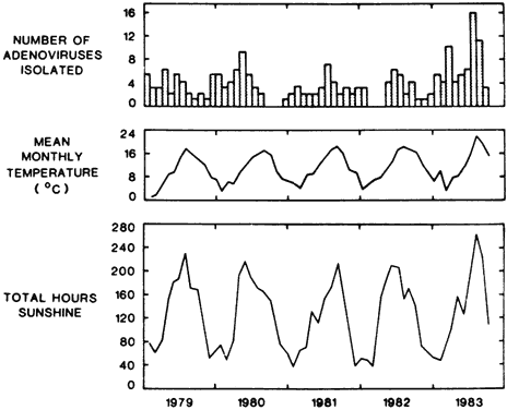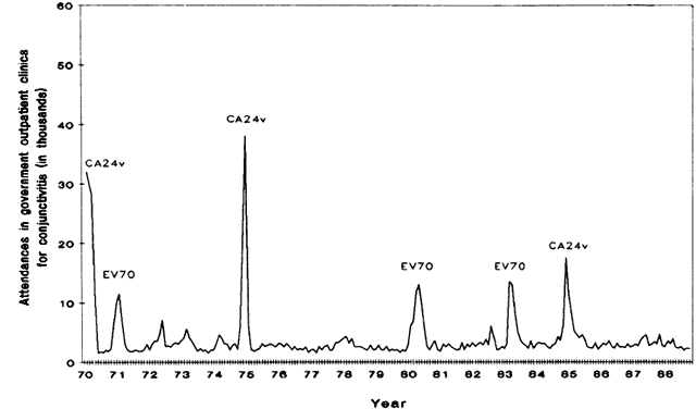 Types 3, 4, and 7 are prevalent causes of pharyngoconjunctival fever; types 8, 19, and 37 are most frequently associated with epidemic keratoconjunctivitis. Adenovirus serotypes occur sporadically over several years in many areas. Specific serotypes may recur in a cyclic pattern (Fig. 20). Genotype changes may account for the emergence of intermediate strains and may play a role in epidemic outbreaks in a susceptible population. Frequency can rise in warm months.92 The relationship of climate to the frequency of adenovirus conjunctivitis (Fig. 21) may be related to methods of transmission. ENTEROVIRUS CONJUNCTIVITIS The first recognized epidemic attributed to enterovirus 70 began in Ghana during 1969 (Fig. 22) and subsequently spread across Africa and the Middle Eastern crescent (Fig. 23), possibly associated with pilgrimages to Mecca. A parallel epidemic caused by enterovirus 70 also erupted in Indonesia in 1969. Another picornavirus, coxsackievirus A24, was first recognized as a cause of acute conjunctivitis causing an epidemic in Singapore in 1970. Both viruses have caused recurring epidemics in Asia (Fig. 24) and spread to Europe and the Americas by travelers and refugees. Several large outbreaks of enterovirus or coxsackievirus conjunctivitis have occurred in the late 20th century, predominantly in the coastal tropics of Africa, Asia, and Central America (Table 24). Small outbreaks and sporadic cases have been recognized in several cities of Europe, the Middle East, Asia, Australia, North America, and South America, and in laboratory accidents. Mixed epidemics of enterovirus 70 and coxsackievirus A24 and of enterovirus 70 and adenovirus have occurred.