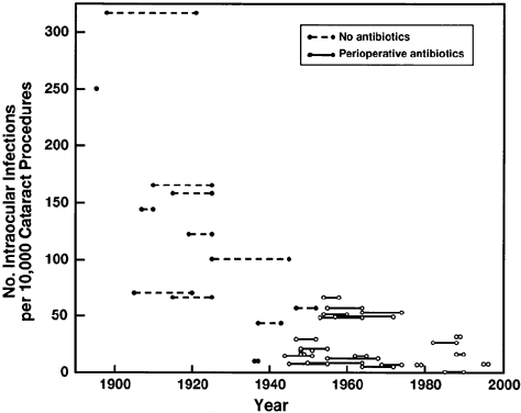 The frequency of intraocular infection after exposure to a contaminated irrigating solution or intraocular lens is not known. In a widespread outbreak of fungal endophthalmitis, infection developed in 4% of those exposed to a contaminated intraocular lens.157 However, defining an outbreak by time and place can be difficult. The paucity of reports of common-source epidemics of postsurgical endophthalmitis173 may belie its frequency. There is no seasonal fluctuation, although posttraumatic infection may be greater in warmer months.174 | ||||||||||||||||||||||||||||||||||||||||||||||||||||||||||||||||||||||||||||||||||||||||||||||||||||||||||||||||||||||||||||||||||||||||||||||||||||||||||||||||||||||||||||||||||||||||||||||||||||||||||||||||||||||||||||||||||||||||||||||||||||||||||||||||||||||||||||||||||||||||||||||||||||||||||||||||||||||