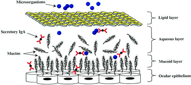 EYELIDS AND EYELASHES The first line of defense against ocular infection is provided by the eyelids. This mechanical barrier, when closed, protects the ocular surface and its surrounding tissues from exposure to pathogens, allergens, and other foreign bodies. The ocular surface is highly innervated and exquisitely sensitive to mechanical disturbance. Even the slightest contact with the eyelids, eyelashes, or corneal surface elicits the blink reflex. This blinking action serves to wash pathogens and other foreign particles from the ocular surface and to renew the tear film. Conditions that interfere with normal lid function, including conjunctivitis and keratitis, may render the eye more susceptible to infections.4 TEARS AND LACRIMAL DRAINAGE The tear film (Table 2) serves multiple functions in the nonspecific defense against ocular infection. It bathes the ocular surface and provides a mechanical barrier to adhesion by pathogenic organisms. It lubricates the corneal surface and facilitates the washing action of the eyelids. Bacteria, fungi, foreign bodies, and desquamated epithelial cells are flushed nasally toward the two puncta by this highly efficient washing mechanism.