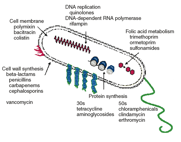 concerns for antibiotic resistance.1 Immunomodulatory actions of antibiotics include direct effects on phagocytosis via opsonization or oxidative intermediates, on chemotaxis, on lymphocyte proliferation, on cytokine production, and on delayed hypersensitivity and natural killer cell activity. Antibiotics shown to be upregulating include the imipenems, cefodizime, and clindamycin. Downregulation is demonstrated by the tetracyclines, erythromycin, roxithromycin, cefodizime, rifampicin, gentamicin, teicoplanin, and ampicillin.2 The ideal antiinfective agent would combine an enhancement of the natural bacterial killing mechanism and downregulation of an exaggerated inflammatory response.3 Pharmacoeconomics compares the costs and consequences of antibiotic therapy in view of efficacy, safety, and health system expenditures.4 Cost factors are continually changing as drug patents expire and improved agents become available. Overall costs are related as much to the method of delivery as to the individual agents selected. The Endophthalmitis Vitrectomy Study not only showed the lack of effectiveness of intravenous therapy but also the characteristics of the infection indicating the need for more expensive vitrectomy in conjunction with intravitreal antibiotics.5 Bacterial resistance is due to a variety of mechanisms that aim at disrupting the antimicrobial mechanism of action (Fig. 1) Increasing resistance of ocular pathogens represents an important therapeutic challenge. Antibiotic resistance is caused, paradoxically, by both overuse and underuse. Especially in developing countries, resistance often develops when people stop taking their medication as soon as they feel better.6 In the United States, resistance more often stems from overuse. The Centers for Disease Control and Prevention estimates that as many as half of the antibiotics prescribed by office-based physicians each year to treat colds, coughs, and other viral infections are unnecessary.6,7 The result of the overuse of antibiotics for systemic use, ophthalmic use, and in poultry and livestock feed, is an increasing number of bacterial strains that are stronger than the antibiotics being used against them.