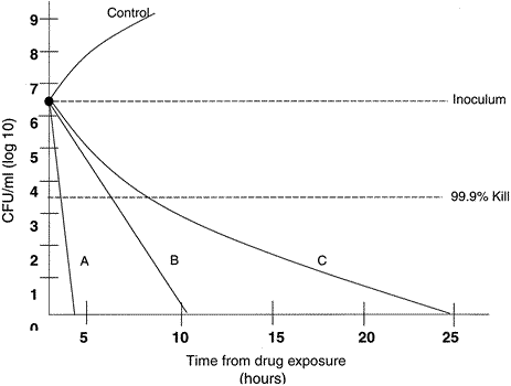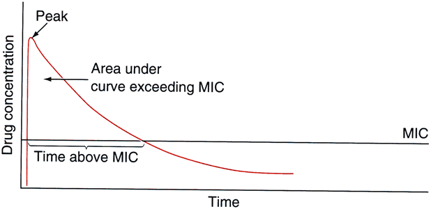 body 8 The minimal inhibitory concentration (MIC) is the lowest concentration of an antimicrobial agent that prevents visible growth of bacteria after a period of incubation in vitro.9 The MIC90 is the concentration at which 90% of the isolates by genus and species are inhibited (not killed). The MIC90 is ideally based on at least 100 organisms.10 For antimicrobial therapy to be effective, it is believed that a drug should, at a minimum, reach a concentration that at least exceeds the MIC90 of the target organism. The breakpoint MIC (MICBP) of a drug is a yardstick against which the MIC for an infecting organism can be compared. The MICBP is that MIC separating susceptibility from resistance and is typically the concentration of a drug that is achieved reasonably in the serum or tissue. An organism is considered susceptible (S) if its MIC is one sixteenth to one fourth the peak drug concentration that will be achieved using the recommended dose of a drug, but this should be correlated with clinical response to the selected antimicrobial.10,11 If the MIC of the organism equals or surpasses the MICBP, the organism is considered resistant (R).11 The breakpoints in defining bacterial resistance are based on what can be achieved with systemic therapy, and therefore they may not always reflect ocular levels. The minimal bactericidal concentration (MBC) is the lowest concentration of antimicrobial that totally suppresses growth on antibiotic-free media or that results in a 99.9% (3 log) reduction or greater decline in colony counts after overnight incubation. The MIC may be the same as the MBC, but the MBC can be several multiples of the MIC, in which case the organism is said to be resistant.9 Bactericidal drugs are defined as drugs whose MIC is very close to the minimal bactericidal concentration. However, the bactericidal effects of a drug depend on achieving sufficient concentration of the drug at the antimicrobial target tissue.12 It is important to note that bactericidal drugs can be rendered bacteriostatic should insufficient concentrations be reached. A drugs whose MBC is more than 16-fold greater than the MIC is bacteriostatic. The inhibitory quotient (IQ) is the ratio of the antibiotic concentration in the target tissue to the MIC90 of a particular organism.13 Generally, an IQ greater than 4 is preferred, because otherwise the antibiotic may inhibit the growth of the organism but not kill it. The concept of the “inhibitory quotient” links pharmacodynamics to pharmacokinetics but is susceptible to manipulation. For instance, the numerator is typically a mean tissue concentration, which does not reflect the high patient variability of 50% or more seen in drug penetration studies. The denominator can also be manipulated if strains are pre-selected or if several resistant strains are included. For this reason, development of an IQ expressed as a range of 25% to 75% might be a more accurate value than one number. The relationship between bacterial killing and microbiological activity is described by the area under the curve (AUC) divided by the MIC of the organism (Fig. 2). This is known as the AUC/MIC ratio or area under the inhibition curve (AUIC). The AUC/MBC ratio is also used. Aminoglycosides and fluoroquinolones exhibit concentration-dependent killing; that is, bacteria succumb more rapidly when exposed to concentrations greatly in excess of MIC values than to concentrations just above their MIC. For β-lactams and glycopeptides (cellwall–active agents) this is not the case, and further increases to more than 4 to 8 times the MIC do not increase the rate of bactericidal kill.14 Not surprisingly, some studies note a plateau of fluoroquinolone induced killing rate at very high multiple of AUC/MIC.15 Microbial killing of aminoglycosides and fluoroquinolones is most likely linked to high AUC/MIC ratios, but high peak concentrations may be important to suppress resistant mutants. If the peak concentration (Cmax) to MIC ratio is not high enough, a mutant subpopulation may emerge (16). Thus, using a dose that is too low or too infrequent is particularly detrimental with fluoroquinolones and aminoglycosides. Time-kill curves11 are derived from in vitro susceptibility tests that determine both the overall killing capability of the antibiotic and the time required to kill. The end point is the MBC, which means that 99.9% of bacteria are killed, compared to the MIC90, in which 90% are inhibited (Fig. 3). The potential advantage of time-kill curves is that they add a time component to the measurement of bacterial killing. However, all too often, the full potential of this approach is not realized because of inappropriate experimental design and/or suboptimal quantitation of bacterial killing and regrowth curves, or the antimicrobial effect itself. Specifically, most of these studies have simulated human pharmacokinetics over a narrow dose range. This may not be appropriate for comparing different drugs, especially if the antimicrobial concentrations are close to the minimum or maximum values. Many time-kill curve studies are flawed because they compare different antibiotics at the same concentration, thereby ignoring pharmacokinetic factors such as the different penetration levels of drugs. Time-kill curves can vary greatly for a given antibiotic depending upon the concentration studied. The one-dose nature of such studies does not provide evaluation of the equiefficient dose of a new drug (the dose of the new drug that produces the same effect observed with a reference drug at its usual dose). Finally, most studies do not include a sufficient duration of observation to cover the entire regrowth phase in time-kill curve studies.17 Persistence of antimicrobial effects after brief exposure to, or the lack of detectable concentrations of, an antimicrobial is termed the post-antibiotic effect (PAE).18 For some drugs (e.g., fluorinated quinolones and aminoglycosides), the duration of the PAE, a