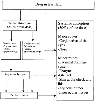 study of what the body does to the drug.1 The eye is one of the few structures that can be considered pharmacokinetically separate from the body. This separation is possible because of two main factors: (1) absorption occurs directly into the eye before reaching the systemic circulation, and (2) elimination occurs directly into the body, which can be considered a large reservoir that can dilute drug concentration below a therapeutic threshold.21 There are five barriers to the entry of drugs into the eye (Fig. 4): Corneal epithelium—Restricts the entry of water-soluble drugs into the cornea and aqueous