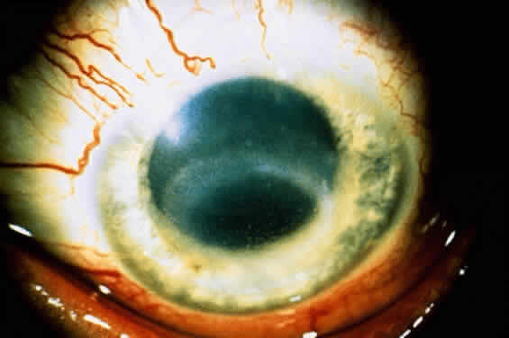 Moore and associates57 described radial keratoneuritis as a presenting sign in Acanthamoeba keratitis. Radial keratoneuritis is characterized by linear, radial, branching infiltrates found in the midstroma, which appear to be located along corneal nerves. These infiltrates begin paracentrally and extend to the limbus in a radial pattern. Conjunctival injection and chemosis are present as a rule. Adenopathy may or may not be present. Acanthamoeba keratitis is characterized by a fluctuating, nongranulomatous inflammatory reaction in the anterior chamber. McClellan and Coster60 cultured Acanthamoeba organisms from an anterior chamber paracentesis in a patient with severe keratitis. Elevated intraocular pressure and cataract, presumably secondary to the anterior segment inflammation, may be seen. Mannis and colleagues59 reported that 39% of cases demonstrated sufficiently pronounced anterior segment inflammation to produce hypopyon. Severe pain, often out of proportion to the degree of anterior segment inflammation, characterizes this disorder, particularly as the keratitis becomes chronic.24,57,59,61 Patients who present with epithelial involvement alone may not complain bitterly of pain.56 A distinguishing feature of Acanthamoeba keratitis is the prominent scleral inflammatory component. Although anterior scleritis may be part of the clinical presentation, the severe ocular pain characteristic of Acanthamoeba keratitis suggests that scleritis may occur commonly in chronic cases of Acanthamoeba keratitis. In some reported cases, the ocular pain became so severe that retrobulbar alcohol injections had to be given.62 A ring-shaped stromal infiltrate is characteristic of advanced infection and is nearly pathognomonic of Acanthamoeba keratitis (Fig. 2).61 The infiltrate is often most dense in its peripheral aspects, forming a characteristic ring. This annular infiltrate may be segmental or circumferential, may be progressive, often involves stromal thinning or furrowing, and may be associated with a variable overlying epithelial defect. The arcuate or ringlike infiltrate is due to polymorphonuclear leukocyte infiltrates generated by chemotaxis after antigen-antibody precipitation,63 analogous to the infiltrate described by Wessely64 after injecting horse serum into the cornea.65