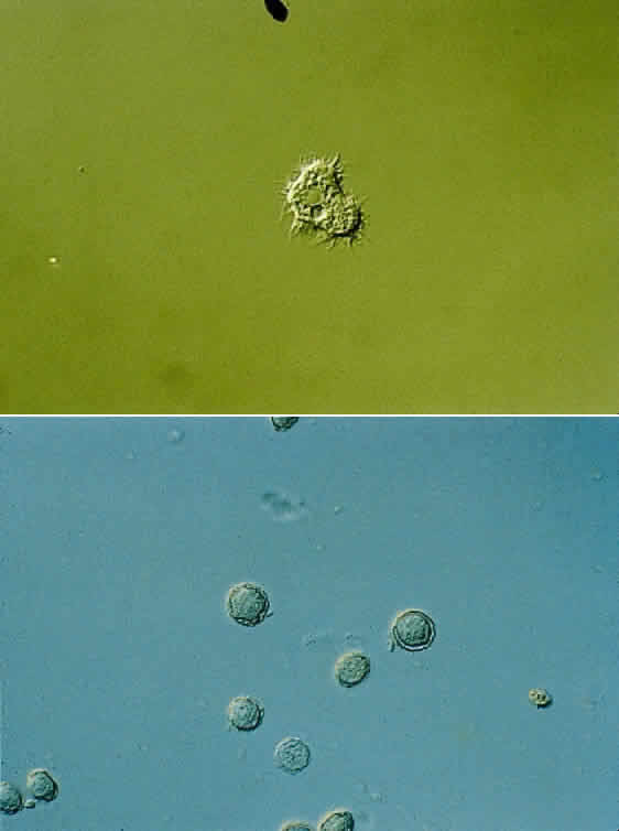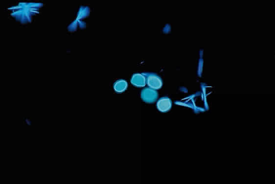 more sensitive in detecting the presence of Acanthamoeba. Whatever methods are used for the detection of Acanthamoeba, the observer must be familiar with the morphologic characteristics of trophozoites and cysts, and must have culture or other reference material available for comparative study. Similarity of amebae to inflammatory and epithelial cells in wet mount and stained preparations may make differentiation especially difficult. Corneal scrapings, biopsy imprint smears, and fluid from contact lens cases can be directly examined using a variety of stains and optical techniques. Direct wet-mount examination of corneal scrapings or other fluid specimens for rapid identification of trophozoites or cysts is a common laboratory procedure. Such specimens may be examined by brightfield microscopy, although the use of phase contrast or differential-interference contrast microscopy is preferred. Examination is made for cells suggestive of trophozoites on the basis of size, nuclear characteristics, and presence of vacuoles and acanthopodia (Fig. 3, left). Cysts are more readily recognized by their typical double-walled structure: the ectocyst wall often appearing wrinkled and the endocyst polygonal or stellate (see Fig. 3, right). A variety of stains may be used on dried and fixed specimens, including Giemsa, Wright's, Wheatley's trichrome, and hematoxylin and eosin. Gram's stain is not an optimal one because the organisms stain faintly and resemble other cellular elements. The fluorochrome calcofluor white is especially useful in identifying amebic cysts because of the presence of complex polysaccharides in the cyst wall, and it offers enhanced sensitivity for detection in methanol-fixed specimens (Fig. 4).118 Also, this stain is readily available in most diagnostic laboratories, where it is commonly used for fungal examinations. Direct fluorescent antibody staining is both sensitive and specific for Acanthamoeba, but is not currently available from commercial sources.119