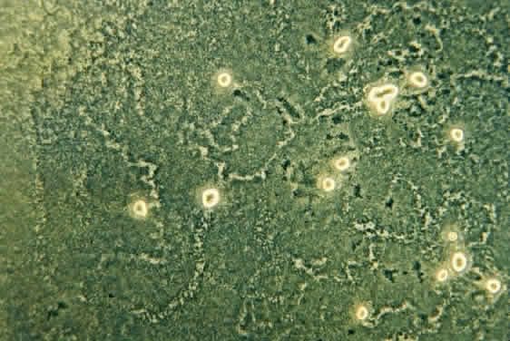 Cultivation of acanthamoebae from clinical specimens remains the most sensitive and specific diagnostic procedure available. Although acanthamoebae will grow on a variety of enriched bacteriologic culture media, contaminating bacteria can mask the growth of acanthamoebae on these media, making their detection difficult. Use of a 1.5% non-nutrient agar plate overlaid with a lawn of live Escherichia coli or other coliform bacilli is a simple and highly effective medium for the recovery of all Acanthamoeba species.10,120 Corneal scrapings, triturated tissues, or fluid specimens are applied directly to the center of the plates, which, in turn, are placed in a sealed bag to maintain humidity and incubated at ambient temperature. Plates are examined microscopically daily for up to 10 days using the low-power (× 10) objective with the condenser lowered or, ideally, with an inverted microscope for the presence of trophozoites and their tell-tale trails left in the bacterial lawn (Fig. 6). Detection of growth is subsequently confirmed by examining the organisms in wet-mount preparations.10