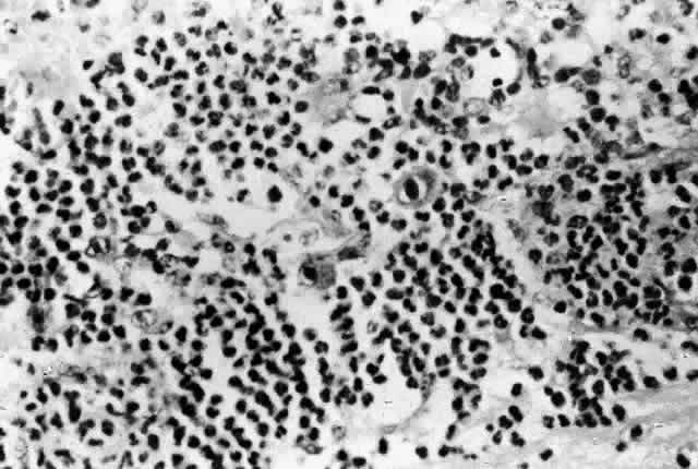 Cytomegalovirus (CMV) retinopathy is by far the most common of the severe ophthalmic infections in patients with AIDS. Varicella zoster virus retinopathy is being seen with increasing frequency; although it is probably the second most common retinal infection in North American HIV-infected patients, it is still far less common than CMV retinopathy. Toxoplasmic retinochoroiditis is the third retinal infection that is seen with some regularity, especially in certain areas of Europe and South America. The remaining retinal infections associated with AIDS are uncommon. They are seen with disseminated infections, in which the massive proliferation of organisms may overwhelm the patient's limited immune defenses. They are usually seen late in the course of the syndrome; thus, they may actually signal further waning of immune defenses. Patients with intraocular infections should be suspected of having tissue-invasive infections involving other internal organs. When they do occur, intraocular infections are frequently extensive and severe. Infections of the cornea and external eye are less common in HIV-infected individuals than intraocular infections. The natural defenses of normal eyelid function, tear film, and an intact corneal epithelium protect against many exogenous pathogens. It is therefore important that factors that might compromise those defenses, such as epithelial defects or trichiasis, be corrected as soon as possible. Also, HIV-infected patients who wear contact lenses should adhere strictly to lens care and disinfection techniques. Many HIV-infected individuals appear to have decreased aqueous tear production, which leads to feelings of dryness and irritation but does not seem to result in an increased incidence of ocular surface infections. At greater risk are patients who have permanent damage to the eyelids from zoster ophthalmicus, neurotrophic corneas from herpetic infections, or damage to the ocular surface from cicatricial conjunctivitis, similar to that of Stevens-Johnson syndrome, which is seen occasionally in patients with AIDS. HIV infection and its sequelae are being studied in a variety of animal models. Rhesus monkeys infected with simian immunodeficiency virus develop an AIDS-like illness. In this model the monkeys develop a variety of ophthalmic lesions, including CMV infections of the retina.10 This model may be useful for future studies of AIDS-related ophthalmic infections. CYTOMEGALOVIRUS Cytomegalovirus retinopathy is the most thoroughly studied of the ophthalmic manifestations of HIV infection. CMV retinopathy is an AIDS-defining index disease. Most studies have concentrated on treatment, but a great deal has been learned about the natural history of CMV retinopathy during the course of these studies. Cytomegalovirus is a ubiquitous DNA virus of the herpes group. Most of the adult population has been infected with CMV, but in most cases it does not cause any clinically apparent disease. The virus remains in the body, however, as a latent infection. In patients with AIDS, CMV can cause life-threatening infections involving many tissues, including the brain, lungs, and gastrointestinal tract. The reported prevalence of CMV retinopathy varies from 4% of ambulatory patients (primarily intravenous drug abusers)11 to 34% of eyes in an autopsy series of male homosexuals.9 This discrepancy may reflect the fact that CMV retinopathy occurs late in the course of AIDS. Most investigators believe that the true prevalence of CMV retinopathy among patients with AIDS is approximately 15% to 25%. It has been suggested that CMV retinopathy is more common in homosexuals, because of different levels of exposure to CMV between risk groups.11,12 Cytomegalovirus retinopathy is clearly a disorder of immunosuppressed persons. Prior to its association with AIDS, the infection in adults was seen almost exclusively in patients with defects in cellular immunity related to disease or immunosuppressive drugs.13,14 A single report of CMV retinopathy in a healthy adult was not confirmed by culture or tissue examination.15 There is no obvious correlation between the development of CMV retinopathy and levels of CMV antibodies. CMV retinopathy has been reported in the absence of detectable antibodies.16 Histologic studies of AIDS-related CMV retinopathy demonstrate the tissue necrosis and cytomegalic cells characteristic of all CMV infections (Fig. 1).9,17 Electron-microscopic and immunochemical studies have identified CMV viral particles and antigen in a patchy distribution throughout all layers of the retina and occasionally in contiguous retinal pigment epithelial cells.9 Viral antigens are only rarely identified in the choroid.9,18 Viral antigen in the choroid has been found in association with vessels and is not always adjacent to areas of retinopathy, suggesting that the virus reaches the choroid through independent hematogenous spread rather than by extension of infection from the retina. Among cases of AIDS examined at autopsy, 22% to 50% of those with CMV retinopathy have neutrophilic infiltrates in retinal tissue.9,19 This finding is atypical when compared with CMV retinopathy in non-AIDS patients, in which only a sparse lymphocytic infiltrate is observed. The difference has been attributed to intact granulocyte function and chemotaxis in patients with AIDS, in contrast to infants, organ transplant recipients, and patients with malignancies who can have more severe quantitative or qualitative granulocyte dysfunction.9 It has been noted that patients on immunosuppressive drugs can develop marked inflammatory reactions to CMV retinopathy when such drugs are withdrawn.14 Acute inflammatory cells may extend into the adjacent choroid despite the absence of identifiable viral antigens.9 The vitreous usually remains remarkably free of inflammatory material, despite the presence of virus in the vitreous cavity.20 A variety of stimuli (CMV antigen, immune complex deposition, and tissue necro