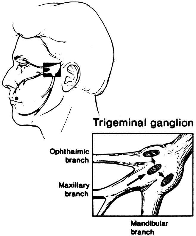 PRODUCTIVE (LYTIC) INFECTION Like all viruses, HSV-1 is an obligate, intracellular parasite and, therefore, requires a healthy host mammalian cell to produce new progeny viruses through a productive (lytic) replication cycle6 (Fig. 3). Following attachment of the virion to the host cell by specific receptors (viral envelope glycoproteins gB and gC and cell surface heparin sulfate), the nucleocapsid gains entry to the cell by fusion of the envelope with the plasma membrane. The nonenveloped nucleocapsid is transported via cytoskeletal elements of the host cell to the nuclear pores where the viral DNA is released into the nucleus. A tegument protein of the parental virus rapidly inhibits host protein synthesis to allow for efficient translation of virus-specific transcripts by host ribosomes.24 After viral DNA enters the nucleus, a well-coordinated cascade of events takes place that leads to gene expression. In general, viral DNA is transcribed in the nucleus into messenger ribonucleic acid (mRNA) molecules using host RNA polymerase II in participation with several viral factors. The virus-specific mRNAs are then transported to the cytoplasm where they bind to host ribosomes to assemble amino acids into virus-specific proteins. It is important to recognize, however, that HSV-1 gene expression is tightly regulated and actually occurs as a cascade in three distinct waves of transcription to yield three distinct classes of viral proteins designated immediate-early (alpha), early (beta), and late (gamma).25 Transcription of immediate-early genes is stimulated by a tegument protein known as VP16 or α-transinducing factor (α-TIF) of the parental virus that requires an existing cellular transcription factor to function, but does so in the absence of de novo virus-specific protein synthesis.26 The synthesis of immediate-early proteins reaches peak rates at approximately 2 to 4 hours postinfection. Immediate-early proteins have regulatory functions and are required for the synthesis of the second group of viral proteins, the early proteins. This group of proteins reaches peak rates of synthesis at about 5 to 7 hours postinfection and includes many enzymes involved in viral DNA replication such as thymidine kinase and DNA polymerase. Importantly, the early proteins serve to downregulate the synthesis of immediate-early proteins and ultimately to induce the synthesis of the late proteins. Structural proteins such as the capsid proteins and envelope glycoproteins are included among the late proteins that also serve to downregulate the synthesis of the early proteins. Late proteins destined to become envelope glycoproteins acquire their carbohydrate sidechains by using the glycosylation machinery of the host cell. Completed glycoproteins are inserted into all host cell membranes including the plasma membrane where they serve as important targets for immune surveillance. Viral DNA replication takes place in the nucleus following early gene expression that supplies many of the enzymes needed for DNA synthesis. The HSV-1 genome contains three origins of DNA replication that leads to DNA synthesis by a rolling circle mechanism, yielding concatamers that are cleaved into monomers and ultimately packaged into capsids.27 Why three origins of replication exist on the HSV-1 genome remains unclear. Only a small portion of the total input viral DNA from parental virions is actually replicated. Assembly of progeny virus particles occurs in several distinct stages. Following the packaging of newly synthesized DNA into preassembled capsids, the virus matures and acquires infectivity by budding through the inner lamella of the cellular nuclear membrane that has been modified by the insertion of several different virus-induced glycoproteins. The mechanism by which the mature virus particle exits the host cell remains a topic of debate. The favored hypothesis includes transport of the virus from the nucleus to the cell surface via the endoplasmic reticulum and Golgi apparatus. In fully permissive tissue culture cells, the entire productive (lytic) replication of HSV-1 takes approximately 18 to 20 hours. Cells that are productively infected with HSV-1 do not survive. Productively infected cells undergo major structural and biochemical alterations almost at the outset of the reproductive cycle. These profound alterations ultimately result in the death and destruction of the host cell, a process known as virus-induced cytopathology. ESTABLISHMENT AND MAINTENANCE OF LATENT INFECTION HSV-1 is transmitted to mucosal surfaces by close personal contact. The most common site of primary HSV-1 infection is in the facial area served by the maxillary division of the trigeminal nerve. Although primary virus infection is often inapparent, infection of this area leads to the establishment of a latent infection in the maxillary division of the trigeminal ganglion (Fig. 4). Following a round of productive infection in epithelial cells, the virus enters the nerve endings of the local sensory and autonomic nerves innervating the area of infection. Virus replication in epithelial cells may not be an absolute requirement, however, because replication-defective HSV-1 mutants can also infect neurons and establish a latent infection in experimental animals.28 It is thought that the virus loses its envelope on entry into the neuron, and the nucleocapsid is transported by microtubule-dependent retrograde axonal flow to the neuronal cell body at a rate of 5 to 10 mm/hr.22 In some neurons, virus undergoes a productive replication cycle that results in the spread of new infectious virus particles to other neurons via transsynaptic spread. This would account for local virus spread among cells within the ganglion (including nonneuronal satellite cells), more distant virus spread to other ganglia through synaptic contact, or possible virus spread to the central nervous system. Primary HSV-1 infection is normally restricted to the trigeminal ganglion