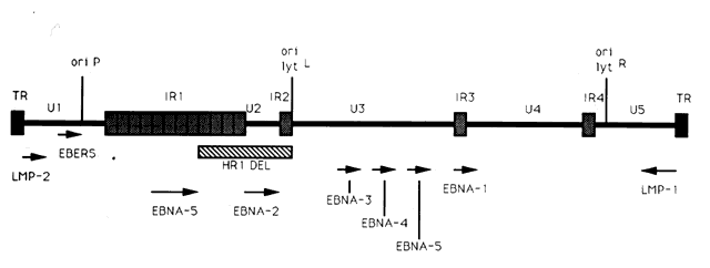 to the lytic phase of its life cycle.44 The entire EBV genome has been cloned and sequenced.45–47 Within virus particles, the EBV genome is linear and contains terminal repeats on either end of the genome (putatively thought to be important in circularization of the virus and/or integration of the EBV genome into cellular DNA), four internal repeat (IR1-IR4) regions, and five unique (U1-U5) sequence domains (Fig. 1). Approximately 100 open reading frames have been identified within the EBV genome that may potentially be transcribed and translated into proteins that are essential for the maintenance of the different phases of the EBV life cycle.44 Molecular biology techniques have allowed for the manipulation of many of these EBV genetic sequences. As a result, these in vitro studies have provided insight into the potential function of many of the EBV genes and how infection may be controlled. Although it is known that adsorption of EBV to a permissive cell occurs by interaction of the EBV gp350/220 envelope glycoprotein with the EBV/complement receptor, CD 21, on the surface of the cell,48 it is not clear how the envelope or nucleocapsid is dissolved or how the EBV DNA penetrates the cell nucleus. It is known that once the EBV genome enters the nucleus, it circularizes and that the cellular phenotype is a key factor in determining the pattern of EBV gene transcription and the consequences of virus infection on the cell.49 EXPRESSION OF EBV GENES DURING THE LATENT STAGES OF INFECTION Two types of latent EBV infection have been identified: (1) active latent infection with transcription of EBV oncoproteins that transform (or immortalize) B cells into lymphoblasts,12 and (2) passive latent infection that is typically utilized by the virus after infecting small resting B cells and during which transcription of only one gene (EBNA-1) has been identified. A limited number of EBV genes have been reported to be expressed during the active latent (or growth transformation) phase of EBV infection (see Fig. 1).44 These include (1) six EBV nuclear antigens (EBNA-1, -2, -3, -4, -5, -6); (2) the latent membrane proteins (LMP-1 and LMP-2); and (3) two small, nonpolyadenylated RNAs (designated EBER-1 and EBER-2).11 mRNAs encoding each of the EBNA proteins are generated by individual splicing of long rightward transcripts initiated at one of two promoters, one located in the Bam HI C region within the U1 region of the genome, and the other in the IR1 region of the genome. The LMP transcripts are expressed from separate promoters which run in opposite directions, but share the same bidirectional control region. The EBNA-2 protein appears to be important in the transformation of B lymphocytes into immortalized cells because mutant EBV strains lacking this gene (such as the HR-1 strain with the deletion noted in Fig. 1) are incapable of immortalizing B lymphocytes.44 One of the mechanisms by which EBNA-2 may modulate growth transformation is through its ability to upregulate latent membrane protein-1 (LMP-1) transcription.50 LMP-1 is one of the most abundantly transcribed genes in EBV infected lymphoblastoid cell lines (LCLs).51 LMP-1 has recently been reported to be essential for B-lymphocyte growth transformation. EBV strains with deletion mutations in the LMP-1 gene were found to be incapable of immortalizing B lymphocytes.52 LMP-1 has been shown to be responsible for many of the phenotypic changes observed in EBV-infected B-lymphocytes including upregulation of expression of B-cell activation markers (CD21 and CD23), the cell membrane adhesion molecule ICAM-1, and the bcl-2 protooncogene.53 Increased expression of adhesion molecules facilitates cell clumping which may enhance B-cell growth and proliferation via paracrine growth factors. T cells also adhere to B cells expressing these adhesion molecules, and such T-cell adherence may represent the initial step in the host immune response to EBV infection that ultimately leads to elimination of EBV infected lymphoblasts in vivo.54 EBNA-1 is the only protein transcribed in the passive latent state. EBNA-1 has been reported to play an important role in maintaining EBV latency.44 EBNA-1 has been shown to bind to specific DNA sequences located at three sites within the EBV genome. One of these sites is located within the oriP domain of the EBV genome (see Fig. 1). Binding of EBNA-1 to the oriP sequences maintains EBV DNA as a closed circular episomal molecule, allows replication of EBV episomal DNA, facilitates transcription of latent cycle genes, and prevents transcription of lytic cycle genes.12 Expression of EBV latent associated genes apparently does not necessarily ensure maintenance of the latent state, because a small percentage (approximately 1%) of latently infected B cells in vitro spontaneously enter the lytic phase of the life cycle and produce infectious virus.1 EBER-1 and EBER-2 are the most abundantly transcribed latent genes with approximately 10)7 copies of each per cell.55 EBER-1 and EBER-2 are small (158 and 178 base pairs, respectively), nonpolyadenylated RNAs that are not translated into proteins. These small RNA molecules are thought to be important in RNA splicing which is an integral function in maintaining latency because EBNA mRNAs are extensively spliced.56 Their abundant copy number per cell makes EBERs excellent targets for in situ hybridization techniques that demonstrate cellular sites of EBV latent infection. EXPRESSION OF EBV GENES DURING THE LYTIC STAGES OF INFECTION In general, most normal B cells that are permissive for latent EBV infection cannot support EBV replication. Epithelial cells have been found to support lytic EBV infection in humans11; however, at the present time an EBV-permissive epithelial cell line for in vitro studies has not been identified.16 Because of the lack of an EBV-permissive cell line, the expression of EBV genomic sequences during the lytic phase of the virus infection has been investigated pred