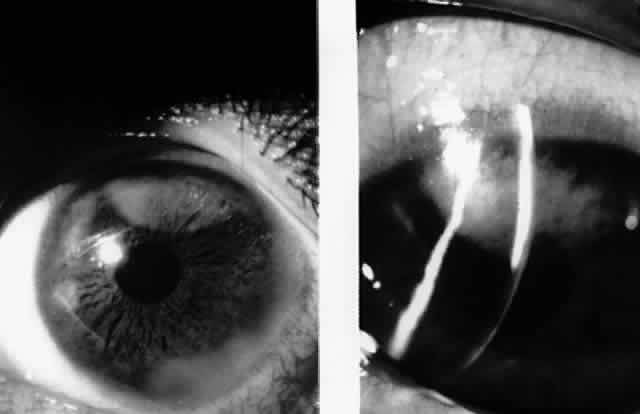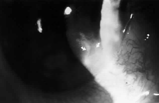 CONJUNCTIVA AND CORNEA There is increasing clinical and laboratory evidence suggesting that EBV is capable of infectingsusceptible cells in the ocular surface epithelia. Expression of CD21, the putative EBV receptor, has been detected in conjunctival and corneal epithelial cells.65 EBV genomic sequences have been detected in 10% of normal corneal epithelial specimens.30 Using highly sensitive reverse transcriptase PCR, EBNA-1 mRNA sequences, but not active latent or lytic cycle associated gene sequences, were detected in 95% of human conjunctival epithelial specimens obtained by impression cytology.31 Taken together, these results suggest that the ocular surface epithelia are sites of EBV persistence following primary infection. Numerous cases of conjunctivitis occuring in patients with IM syndrome were reported prior to the availability of specific tests to confirm a clinical diagnosis of IM.66 More recently, conjunctival involvement has been reported in patients with serologically confirmed IM. In 1981, Meisler and associates reported a case of a unilateral conjunctival inflammatory mass and enlarged preauricular lymph node in an 11-year-old boy with acute IM.67 The conjunctival lesion was biopsied, and an intense lymphocytic infiltrate with occasional multinucleated giant cells was observed in histologic sections. Wilhelmus reported a case of unilateral keratoconjunctivitis in a 16-year-old girl with acute IM.68 This patient had a follicular conjunctivitis and preauricular lymph node. Virus was cultured from the tears and conjunctiva of this patient. Matoba and associates also noted conjunctival inflammation consisting of mild hyperemia occasionally accompanied by a follicular tarsal conjunctival response in a series of patients with IM.69 Gardner and co-workers recently reported a case of a bulbar conjunctival nodule associated with unilateral enlarged preauricular and submandibular lymph nodes in a 38-year-old patient with acute IM. Mature lymphocytes and plasma cells were noted in histologic section, and scattered cells in the lesion stained positively for EBV active latent cycle antigens (LMP-1 and EBNA-2).70 The first reported association between IM and keratitis came from Payrau and Hoel in 1958.71 The authors described a patient with IM, follicular conjunctivitis, and in a single quadrant of one cornea, interstitial infiltrative keratitis. However, theputative association between IM and corneal stromal inflammation in their case is in doubt, because they also found a corneal foreign body within the area of keratitis. In 1980, Pinnolis and colleagues described a 16-year-old boy with classical heterophil antibody-positive (IM) who, upon discontinuation of oral corticosteroids, developed bilateral “nummular interstitial keratitis” without stromal vascularization.72 The corneal opacities were bilateral and symmetric unlike herpes simplex (HSV) and varicella-zoster virus-induced disease, and deeper within the corneal stroma than the subepithelial infiltrates of adenovirus keratitis. Acute and convalescent serologies by indirect immunofluorescence for specific antibody against EBV capsid antigen showed a greater than fourfold rise consistent with acute infection, while antibody titers by complement fixation for HSV, adenovirus, mumps, cytomegalovirus, influenza virus, and respiratory syncytial virus remained low or undetectable throughout the illness. In 1986, Matoba and associates reported 7 patients with purported EBV stromal keratitis, but only 3 of the patients had clinical symptoms of IM or evidence of recent seroconversion.69 In one of the patients, heterophil antibody-positive IM preceded by 1 week the onset of chronic multifocal keratitis. When the authors first examined the patient in referral 9 months later, they found multiple, discrete, anterior stromal opacities in the patient's left eye. In another patient, bilateral, patchy, deep peripheral infiltrative keratitis and a fourfold decrease in antibody against EBV viral capsid antigen were documented at the time of referral 5 months after an “infectious mononucleosis-like illness” associated with bilateral red eyes and photophobia. In another patient, the authors state that IM preceded subepithelial infiltrative keratitis in the left eye by 1 month. When examined 8 months after onset of the keratitis, the patient's left cornea showed features of multifocal anterior stromal and deep peripheral stromal keratitis. Although the other 4 patients in this series did not show evidence of recent EBV seroconversion, their keratitis appeared similar to that of the patients with documented IM. On clinical grounds alone, Matoba and associates postulated that the development of EBV keratitis did not depend on recent EBV infection, but could occur in the chronic carrier state. To summarize the authors' findings in the combined group of 7 patients, the interstitial keratitis appeared in 4 patients as unilateral, multifocal, discrete, sharply demarcated, anterior stromal opacities, 0.1 to 2 mm in diameter, with either a blotchy pleomorphic (Fig. 2) or granular ringlike appearance (Fig. 3), in two patients as bilateral, multifocal, full-thickness or deep stromal peripheral infiltrates reminescent of luetic keratitis (Fig. 4), and in 1 patient with features of both. No patient tested had showed serologic evidence of acute systemic HSV or adenovirus infection. Both patients with keratitis restricted to the peripheral cornea had bilateral disease but lacked serologic evidence for syphilis (nonreactive MHA-TP). Five patients had mild or moderate corneal stromal vascularization. Two patients showed corneal epithelial granularity overlying the stromal opacities.