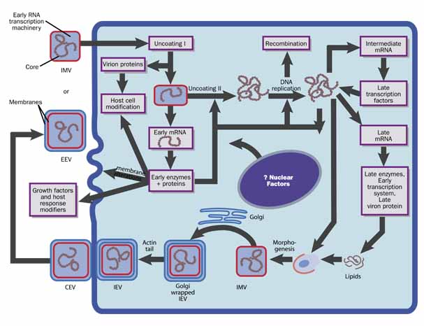 From progeny DNA templates, late transcription factors are expressed from intermediate genes, and late gene RNA is synthesized. Late genes encode the early transcription system, enzymes, and structural proteins necessary for virion assembly. By 4 hours postinfection, virion morphogenesis commences with the formation of membrane structures in the intermediate compartment and the packaging of resolved unit-length genomic DNA. The intracellular mature virus (IMV) has one membrane derived from the intermediate compartment. Some IMVs acquire an additional double layer of intracellular membrane derived from the trans Golgi network that contains unique virus proteins, the intracellular enveloped virus (IEV). IEVs are transported to the periphery of the cell where fusion with the plasma membrane ultimately results in release of extracellular enveloped virus (EEV) or, if attached to the exterior surface of the plasma membrane, as cell-associated enveloped virus (CEV). While IMV and CEV/EEV are infectious, the external antigens on the two virion forms are different. Thus, each virion type probably binds to different cellular receptors and are likely uncoated by different mechanisms. EEVs are thought to be the most important form involved in cell-to-cell spread and systemic disease. |