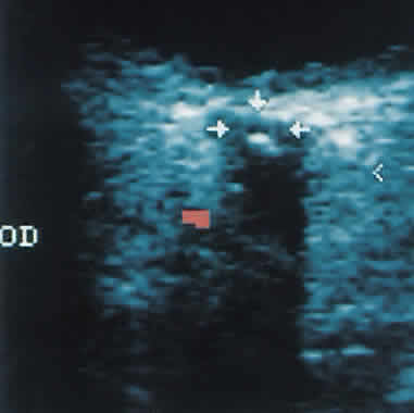 | Color Doppler imaging has been used in a number of other situations. One study used CDI to evaluate eyes with posterior vitreous detachment and to categorize the vitreous gels as either stiff or sloppy based on the ultrasound scatterers during eye movement.40 Another case report used CDI as a diagnostic tool in an eye with persistent hyperplastic primary vitreous.41 Goebel and coworkers6 used CDI to evaluate blood flow in patients with diabetic retinopathy and found that decreased parameters in the central retinal artery correlated with more severe retinopathy. Another study used CDI to evaluate extraocular muscle contractions both before and after botulinum toxin injection.42 |