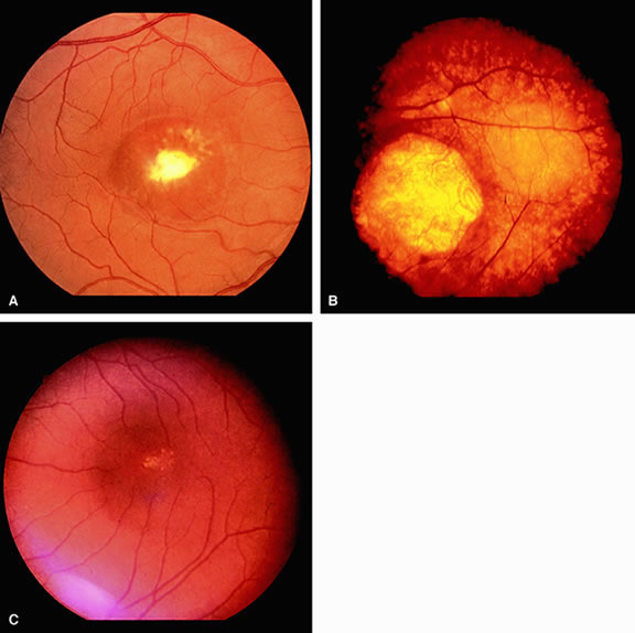 The group of disorders known as pattern dystrophies of the RPE9 and the autosomal dominant disease foveomacular dystrophy10 have been reported to have reduced EOGs in some cases, but the number of exceptions make this test less helpful in these disorders than in Best's disease. A normal EOG is likewise important to rule out Best's disease in certain patients who may present with a vitelliform lesion. These disorders, which are usually an atypical presentation of a macular degeneration (pseudovitelliform degeneration), have a normal EOG; this finding eliminates the necessity of examining other family members. A number of studies have shown a yet unexplained abnormality of the EOG, which may be clinically useful.11 Patients with malignant melanoma of the choroid show a markedly reduced EOG in the affected eye as compared with the normal fellow eye. Although there seems to be no relationship between the size of the melanoma and the EOG ratio, there is a relationship between location and EOG ratio; those in the posterior pole have a greater EOG loss than more peripheral tumors. |