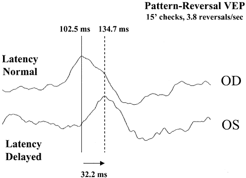an increase in latency of the flash VEP in MS.30–32 Halliday and coworkers33–37 described prolonged pattern VEP latency in a high percentage of patients
