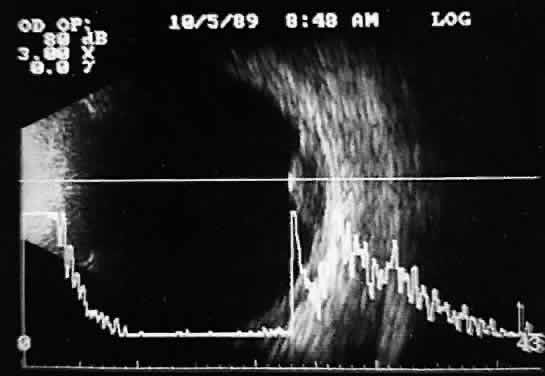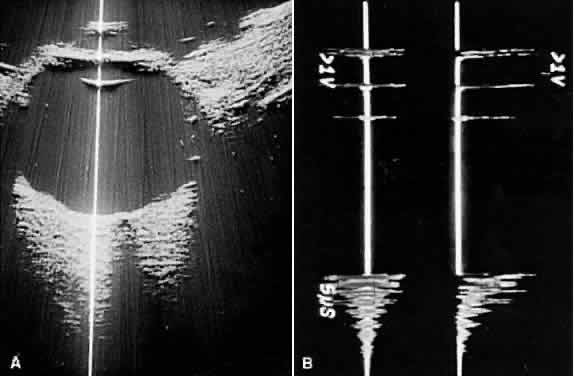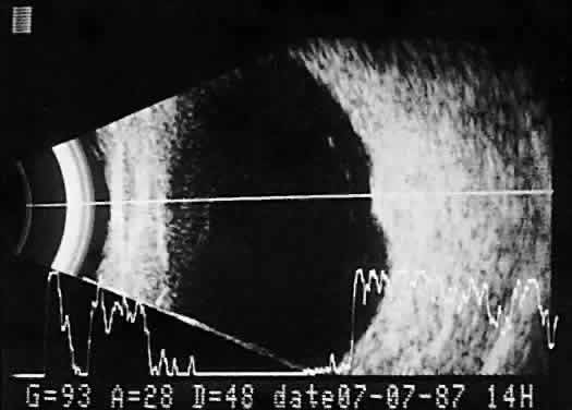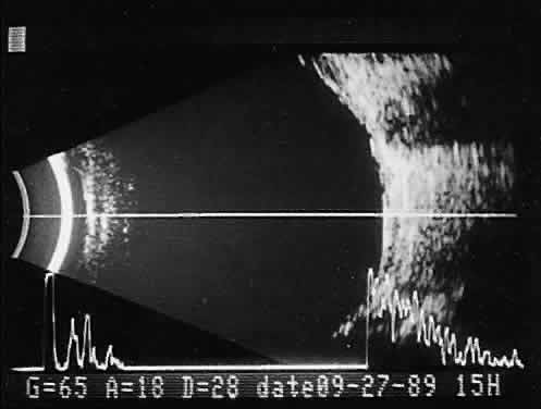 for imaging the anterior segment. Clinical diagnostic forms of ultrasound are based on physical principles of pulse-echo technology and tissue acoustic impedance mismatch. Pulse-echo technology employs synthetic crystal transducers to produce ultrasonic wavefront pulses and retrieve echoes for electronic display and processing. Send-receive sequences are repeated thousands of times each second. Echoes are generated at adjoining tissue interfaces that display differences in acoustic impedance: the greater the difference, the stronger the echo. Retinal tissue, for example, is sonically much different than vitreous (which is essentially water). Therefore, strong reflections occur at such interfaces. When adjoining tissues have relatively small differences in acoustic impedance, as with mild vitreous hemorrhages or clumped intravitreal cells, small or weak reflections are seen. Similar interpretation principles are useful in evaluating types of ocular and orbital tumor tissue. Some lesions demonstrate low-amplitude internal reflectivity; few echoes are seen, and such lesions are described as ultrasonically homogeneous. In contrast, others demonstrate high-amplitude internal reflections; multiple strong retinal echoes are seen, and these lesions are described as ultrasonically heterogeneous. Either tissue type may in addition shadow deeper structures by absorbing or reflecting sonic energy. The presence or degree of shadowing often aids interpretation of ocular and orbital lesions by demonstrating sonic attenuation. Once reflected, echoes are received, amplified, and electronically processed. They are displayed in visual format as A-scan or B-scan images. A-scan (A-mode or time-amplitude) ultrasonography is used predominantly for tissue characterization and interpretation. The horizontal axis of this display represents time or distance and is useful for linear measurements, whereas the vertical dimension reveals echo amplitude and is useful for characterizing tissues (Fig. 1). A-scan may be performed independently of B-scan. B-scan (B-mode or intensity-modulated) ultrasonography provides a cross-sectional image of the globe and orbit (Fig. 2). B-scans are used predominantly for topographic information. There are overlaps of information from A-scan and B-scan; most physicians rely on both forms for adequate ultrasound interpretation, and instruments are available that present B-scan and A-scan images simultaneously (Fig. 3). The display images are presented horizontally in contact scanning and vertically with waterbath (immersion) scanning6–8 (Fig. 4).