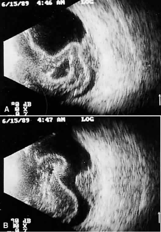 photography. For immersion scanning (waterbath technique), photographs can be used to preserve information; with 35-mm gray scale, review is possible. Immersion scanning, unlike contact scanning, provides images that are derived from an anteroposterior waterbath position. A micrometer device on the examining probe permits sequential still photographic documentation. Dynamic real-time scanning is more difficult with the immersion technique, which relies on rapid multiple manual sweeps of the hand-controlled probe to provide real-time imaging. Real-time changes are best appreciated with motor-driven probes and preserved for future reference on videotape. |