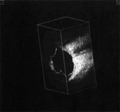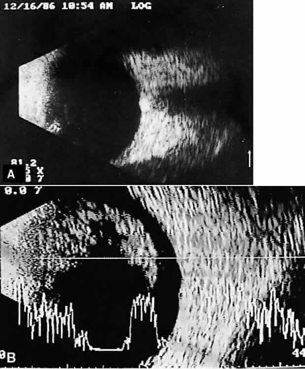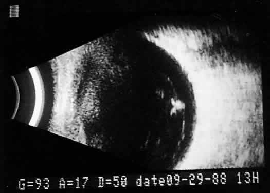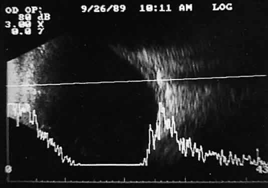 tissue characterization. The B-scan image, a two-dimensional crosssectional display of the globe and orbit, is more easily interpreted than A-scan, especially by examiners familiar with interpretation of ophthalmic pathology, where microscopic and gross crosssectional evaluation of the globe and orbit are routine and often topographically similar to B-scan cross-sections. Several concepts are critical to accurate interpretation of B-scans. These concepts, although relatively easy to define, require considerable experience before the examiner feels comfortable with diagnosis in opaque media situations. These concepts are real time, gray scale, and threedimensional thinking. Real time refers to the display of motion or movement during B-scan imaging. This capability is one of the greatest advantages of B-scan. Differences in mobility of a variety of movable intraocular abnormalities can be easily detected. For example, the rapid movement of vitreous hemorrhage is usually easy to appreciate and differentiate from the slower, undulating movements of a recent, rhegmatogenous retinal detachment. On occasion, movement of intraocular structures can be used for detecting abnormalities that lie immediately behind vitreous opacification and may be seen only when the vitreous opacities are moved away from the ocular wall, set in motion by command voluntary movements of the patient's globe (Fig. 5). Gray scale refers to the variable gray tone of display screen echoes. Strong returning signals (echoes) appear white, whereas weaker reflections are seen as gray, the shade depending on echo strength. Examples of strong reflectors of sound include retinal tissue, sclera, and calcifications of any type (Fig. 6). Weaker echoes from clotted or clumped cells within the vitreous are usually easy to differentiate from the stronger reflectors of sound (Fig. 7). Grading of echo strength may be performed only when the examining ultrasound beam is perpendicular to the object of interest, ensuring the strongest possible reflections. However, in the world of ultrasound interpretation, there are many exception to the rules. Tissues that are usually mild reflectors of sound, such as hemorrhage, can at times appear quite strong, especially in complex or multiple pattern disorders, as frequently occur in severe ocular trauma. These apparent inconsistencies often cause misinterpretation by the novice. With experience obtained by multiple examinations, careful follow-up, and clinical correlation whenever possible, diagnostic acumen rapidly improves.
