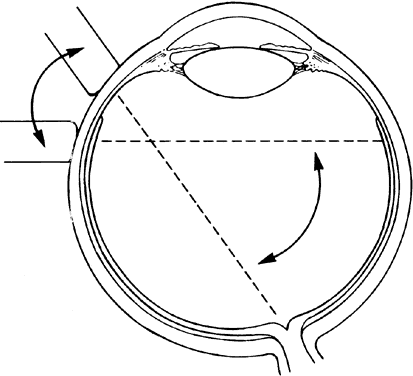3D thinking is the third B-scan concept necessary for accurate interpretation, and the most difficult to master. During B-scan examinations, the contact probe is almost always in motion, creating multiple, ever-changing two-dimensional B-scan cross-sections that must be mentally combined to create a 3D image of the globe and orbit. This technique is most easily mastered by those familiar with 3D spatial relations. The recent development of tomographic ultrasonography makes this concept easier to master because the student can use the computerized 3D image repeatedly, creating a wide variety of theoretical tomographic slices from the 3D image. Recognition of these patterns during future examinations becomes easier. During contact B-scan imaging, each quadrant of the globe is scanned systematically from probe positions that avoid, if possible, any passage of the examining or returning sound through the artifact-inducing lens system (Fig. 8). For the beginner, practice with clear media patients, such as those with total or partial retinal detachment, is essential (Fig. 9). The ultrasonically derived vitreoretinal drawing can then be compared to standard optical examinations. As experience increases, similar but more difficult cases can be attempted. Specifically, B-scan examination of diabetic patients with traction retinal detachments and clear media should be attempted and compared to visually controlled drawings. These self-testing exercises, especially in complex cases, provide the examiner a feeling for his or her level of competence and reliability in 3D thinking. Opaque media cases can then be approached with greater confidence and diagnostic accuracy.