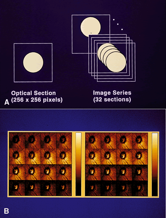 clinical detection. cSLOs represent an adaptation of confocal microscopy, an established imaging technology. The basic principle of confocal imaging is to illuminate through a single pinhole and image this point source on the object of interest. The light returns through the imaging optics and passes through a pinhole in a plane conjugate to the point of interest. Only light that returns from the point of interest can pass through the pinhole and be detected. Light from any point not in that focal plane will be greatly attenuated (Fig. 1). To image a plane rather than a point, an array of points in that plane must be scanned point by point. In a cSLO system, the illuminating light spot can be rapidly moved (scanned) across, resulting in a focal plane of data points or an optical section. This horizontal (x) and vertical (y) scanning is conducted using oscillating mirrors. Depth (z) is controlled (i.e., the focal plane is changed) by moving the objective lens. A transfer function is used to establish the location along the z-axis of maximum reflectivity. This is assumed to be the height at that coordinate and is used to generate the topography image.1 The cSLO generates a robust data set. Using a 256 × 256 matrix and 32 optical sections, the data set is approximately 65,000 height values from more than 2 million data points. When one considers that automated threshold perimetry generates only 72 discrete values, it is clear that powerful analysis strategies are needed to interpret the data. There are many approaches to data analysis. For example, data can be reviewed by pixel, region, or a derived parameter such as neuroretinal rim area. Most current strategies use only a subset of the 65,000 values. A compact laser diode is used as the illumination source. Images can be obtained with light intensities as little as one thousandth of typical fundus flash illumination. The optical resolution is limited by the optics of the eye to about 10 μm transversely and 300 μm longitudinally.2 However, longitudinal measurements can be determined more accurately than this. If the serial optical sections are spaced closely, the height measurement can be determined from the plane of maximum reflectivity. Clinically practical laser scanning optic nerve tomography first became possible in 1986 with the laser tomographic scanner (Heidelberg Instruments, Heidelberg, Germany). This instrument was used principally as a research tool and served as the prototype for the current generation of instruments. There are currently two commercially available cSLO systems—the Heidelberg retina tomograph (HRT; Heidelberg Engineering) and the topographic scanning system (Laser Diagnostic Technologies, Inc., San Diego, CA). Although both systems are based on the principles described above, there are hardware and software differences between them such as laser wavelength and definition of reference surface that makes direct comparisons difficult. No studies have directly compared the two instruments. These systems have been described in detail elsewhere.1–3 For typical optic nerve topographic measurement, the image series height range is defined by the operator to begin above the retinal plane and to terminate below the deepest point of the optic cup. Acquisition of a series of 32 images takes about 1 to 1.6 seconds, depending on the system used (Fig. 2). Examination can be performed undilated or dilated. Current practice is to obtain at least three images per session. Dilation is not needed if the pupil is at least 2.5 mm and the media are clear. The 32 optical sections are processed to create a map with a resolution of 256 × 256 pixels. These 65,536 pixel values represent the height in the image relative to a reference plane (Fig. 3). This matrix of values can be analyzed using software included with the commercial systems, or the raw data can be exported and subjected to research strategies. Once the images have been captured and before the system can compute topographic parameters, the operator must mark the area of interest, usually the optic nerve boundaries (Fig. 4). The computer establishes a retinal reference plane, then compares the depth measurements within the area of interest with respect to the reference plane (Fig. 5). The topographic data can be stored along with the area of interest data for comparison with subsequent images. Raw data can also be stored.