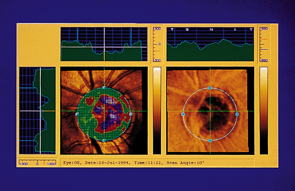 function. Clinical examination of the optic nerve has been possible since the development of the direct ophthalmoscope by Helmholz in 1851. Assessment of the appearance of the optic nerve head (ONH) is an important part of the glaucoma examination. Before the development of advanced technologies, careful comparison of simultaneous stereo-optic nerve photographs was, perhaps, the clinician's best tool for detecting progressive optic nerve damage. The photographs can be stored for subsequent study and review. Unavoidably, however, this technique is qualitative and subjective because it involves the interpretation of subtle findings by the clinician. The need for accurate, reproducible, and cost-effective quantitative techniques of assessing the optic disc, along with appreciation of the limitations of subjective clinical observation, stimulated the development of new technologies. Many of the early innovative techniques developed for quantitative analysis of the ONH were not clinically practical. They suffered from problems with reproducibility, were cumbersome or too costly for clinical use, and did not become widely available. Recent technological advances have stimulated the development of a new generation of instruments, the confocal scanning laser ophthalmoscopes (cSLOs) for quantitative examination of the ONH. The progress in microcomputers, diode lasers, and digital image acquisition have allowed improved capture, storage, retrieval, and analysis of optic nerve topography. |