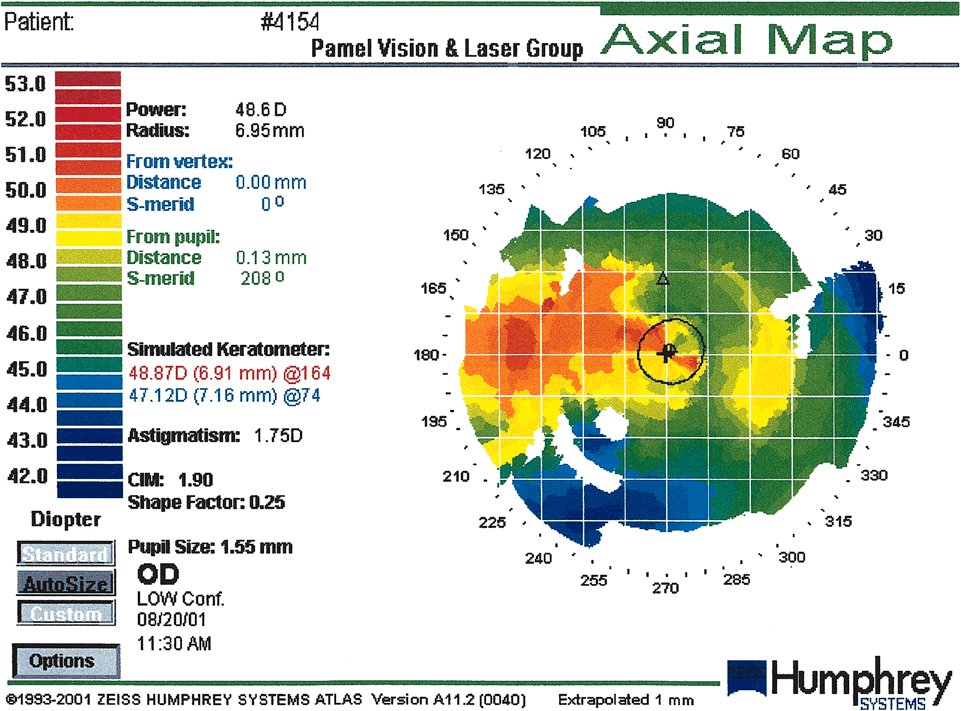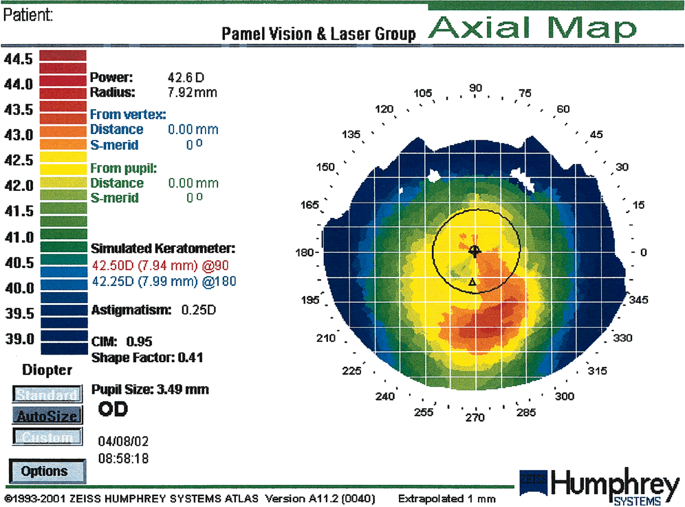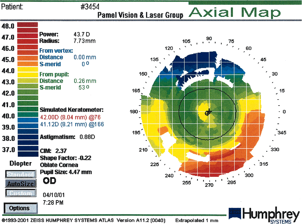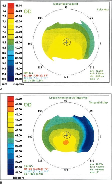 Decentration occurs most commonly as a result of patient movement secondary to loss of fixation. Decentration is measured in relation to the pupil center, rather than to the center of the cornea. Higher-order refractive corrections have a greater incidence of decentration due, presumably, to the longer treatment time. Decentration is considered significant if it is greater than 0.5 mm, but its effect is modified by the size of the pupil and the diameter of the ablation zone. Decentration shows a similar pattern to that of asymmetric astigmatism (show topography). This phenomenon produces visual effects (loss of visual acuity, contrast sensitivity, glare, halos and polyopia) that are greater in patients with large pupils and smaller treated optical zones. Two types of eye-tracking systems have been developed to prevent decentration during laser procedures. Postsurgical centration can be demonstrated by using software that measures the distance from the center of the pupil to the center of the treatment zone and compares this with the corneal vertex, which is the center of the cornea topography. Other complications that may be seen post-LASIK are debris or epithelial cells under the flap, ectasia, striae, and flap defects resulting in irregular astigmatism. Ectasia occurs as a result of changes in the posterior corneal curvature (PCC). Iatrogenic keratoectasia has been reported when the stromal bed is less than 250 μm after LASIK. The average amount of ectasia induced under these conditions is 13 μm. It is important to keep in mind that the error of the ORBSCAN system in pachymetry measurement is ± 20 μm.34 CONTACT LENSES Contact lenses have been used to compensate for distortions of the anterior corneal surface, leading to improved visual acuity. Computerized videokeratoscopy systems contain software to assist the clinician in selecting a lens that is most likely to fit a patient. These systems can provide the clinician with initial lens parameters (posterior lens curvature, optic zone diameter, overall lens diameter, and edge lift) and a fluorescein-pattern simulation. The advantage is that the patient has to try on fewer trial lenses before an appropriate fit is found. In most cases, the clinician determines the final power of the lens after trial lens insertion and over-refraction. Some software programs will also provide the final power of the lens as well. Corneal Warpage Contact lenses have been known to induce topographic changes in the cornea. This phenomenon is known as corneal warpage and is generally reversible with discontinuation of contact lens use. While warpage has been documented with both rigid and soft lenses, polymethylmethacrylate (PMMA) and rigid gas-permeable (RGP) lenses have a greater mechanical effect on the cornea than soft lenses. Signs of corneal warpage are keratometry mire distortion, significant changes in keratometric measurements, and decreased spectacle visual acuity in the absence of clinically observable corneal edema. Generally, RGP lenses induce relative flattening of the cornea under the resting position of the lens and may induce steepening peripherally beyond the lens edge, producing an asymmetric oblate bow-tie pattern.49,50 Corneal warpage may simulate keratoconus with loss of central radial symmetry and the presence of irregular astigmatism due to superior flattening and inferior steepening. Lebow and Grohe compared topography indices of keratoconics and corneal warpage subjects; they determined that corneal shape factor, corneal irregularity measure, and corneal toricity were greater in true keratoconics subjects.51 Refractive surgery candidates are required to discontinue use of contact lenses for a period of time before ocular measurements are made in order to resolve any changes induced by lenses. Corneal topography can be used to diagnose warpage and to follow the resolution (Fig. 19).