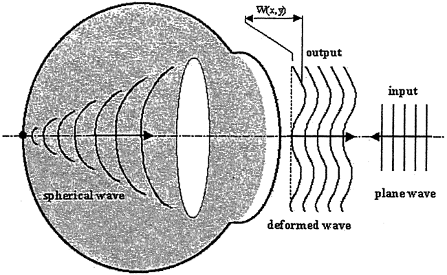 The Orbscan is also capable of calculating corneal power. Mean power maps show the variation of spherical power by calculating the arithmetic average of the principal curvatures for each data point. Astigmatic power maps represent the local astigmatism over the corneal surface, calculating the arithmetic difference of the principal curvatures for each data point. In addition, axial, tangential, and Snell power maps are available, based on the same principles as the Placido disk systems. Rasterphotogrammetry (e.g., PAR Corneal Topography System) is another projection-based system that produces an elevation map of the cornea. Its advantages are that it measures the entire corneal surface, up to 12 mm, and can also measure irregular or de-epithelialized corneas. A projector places a grid onto a corneal surface coated with fluorescein. Fluorescein produces light emissions from the surface of the cornea. Two or more camera systems at a different angle to the cornea from the projector, image the grid. The rays intersect in 3D space, creating the elevation map.3 The latest technology is that of wavefront sensors, which evaluate the sum refractive effects of the cornea, lens, media, and retina. Wavefront sensor technology dates from the 1970s, when Josef Bille, at the University of Heidelberg, applied astronomical principles to the study of the eye. Lightwaves from distant stars traveling through the atmosphere and entering a telescopic lens should be virtually flat. However, interference from the atmosphere produces aberrations in the wavefront. Bille recomposed the imperfect wavefronts into a perfectly round image through the use of different mirrors. Today, wavefront technology is designed to evaluate refractive errors and correct optical aberrations, and it has been applied to laser refractive surgery. Wavefront systems use either the Tscherning aberroscope or the Hartmann-Shack sensor. A laser beam is projected through the cornea, lens, and media onto the fovea; the reflected beam of light produces wavefronts that are captured by a grid of lenses and sensors that lie in a conjugate plane to the cornea. The wavefront's angle of incidence to the lens is recorded by the sensor. The shape of the wave can be reconstructed from the direction that the wave is traveling at each of the grid lenses (Fig. 6). Regions of the wave that are out of phase with a reference point such as the front of the wave can be detected. A computer program develops a color map representing total ametropia at different points. Wavefront maps can determine if the wave emitted from one part of the optical system is out of phase with a wave emitted from another region. The discrepancy in phases can be measured in microns and corresponds to the depth of ablation necessary to produce a flat wavefront. A lens can be formulated to compensate for the aberration, creating a customized ablation pattern. This technology is promising and is currently undergoing clinical trials for use with laser-assisted in-situ keratomileusis (LASIK).4–9 |