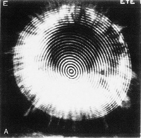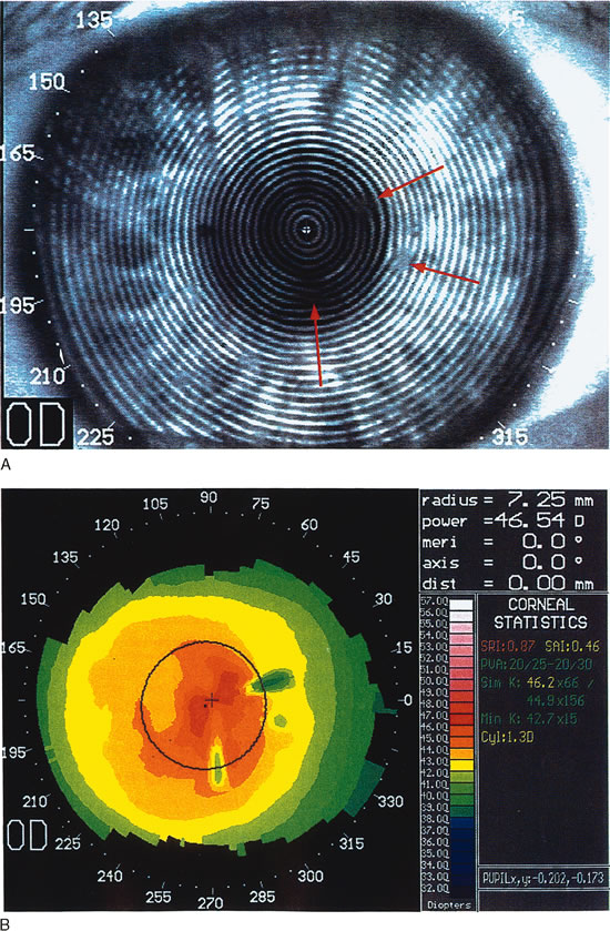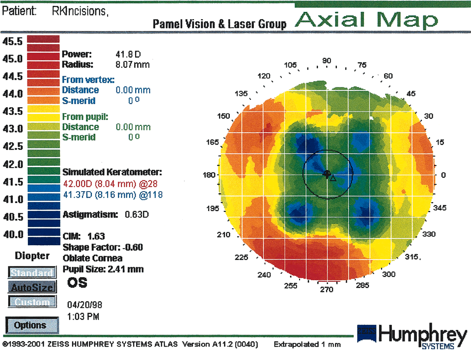 REFRACTIVE CORNEAL SURGERY Topography is relied on in refractive corneal surgery for screening diseases (contact lens–induced corneal warpage, keratoconus), planning surgery (incision location, length, and depth) and in wavefront-guided LASIK. Postoperatively, corneal topography changes can be quantified by difference maps, tangential (local) maps, and indices such as the surface regularity index (SRI) and theSAI. These tools allow the recognition of decentered treatment zones, flap irregularities, and stromal ectasias. Topography can also assist in calculation of intraocular lens power in postrefractive surgery patients who are undergoing cataract surgery. Projection-based systems are preferred because they do not require the anterior corneal surface to be reflective and therefore can be used immediately postoperatively. Cornea shape alteration can affect just the anterior surface or all the layers of the cornea. In the former case, the superficial tissue is removed (excimer laser, keratectomy), added (epikeratoplasty), or structurally altered (laser thermokeratoplasty) without alterations in the stroma or posterior cornea.34 In the latter case, the corneal stroma is changed either by incisions (radial keratotomy, astigmatic keratotomy) or by applying persistent mechanical forces (intrastromal corneal rings). Radial Keratotomy Radial keratotomy (RK) induces central flattening by deep radial incisions. The central 3-mm optical zone remains untouched. The corneal profiles seen after RK (Table 1) are oblate (79%) and a mixed pattern of oblate/prolate (18%). The radial incisions produce a rapid change in slope called the paracentral knee (inflection zone) that lies between the zone of peripheral steepening and central cornea flattening. Topographic patterns seen after RK are the same spectrum as for normal corneas with the addition of the polygonal pattern. The polygonal pattern is seen in 59% of cases and is a concentric pattern with two or more angles (135 degrees) and three or more nearly straight lines that correspond to the central ends of the radial incisions. In all RK cases the corneal asphericity is increased. Initially, maximal flattening is present at the proximal end of the incisions in the paracentral zone, whereas the central cornea remains steeper. With time, the central cornea becomes flatter. The cornea can mimic a multifocal lens as a result of the increased range of diopters within the pupillary aperture35 (Fig. 15).