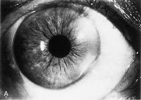 PERIPHERAL THINNING DISORDERS Terrien's Marginal Degeneration Terrien's marginal degeneration is a slowly progressive, painless thinning of the corneal stroma of unknown etiology. It is typically bilateral and is predominantly seen in men. Initially there is deposition of refractile, yellow-white lipid deposits in the superior perilimbal anterior stroma, with radial superficial vessels. Subsequently a gutter 1- to 2-mm wide with intact epithelium develops. This gutter runs parallel to, but does not involve, the limbus. Over time there is deeper involvement of the stroma as well as progression circumferentially. Complications include astigmatism and perforation.26 Mooren's Ulcer Mooren's ulcer is a rare form of peripheral ulcerative keratitis. In 30% of cases it is bilateral. Although the pathogenesis is unknown, there is a strong evidence that it is an autoimmune genetic disease, which is supported by the findings of HLA class II DR17 and DQ2 in 83% of cases; an inflammatory immune response; antibodies to corneal antigens; and resolution with immunosuppressive therapy. It is seen more commonly in Africa and India and is characterized by a previous history of trauma, surgery or infection. The patient presents with an acute, painful ulceration of the peripheral cornea that progresses in a circumferential or transverse fashion. The borders of the ulcer are overhanging; vessels extended from the limbus into the ulcer bed without adjacent scleral melt.About 20% of the cases may progress to perforation. Treatment includes local immunosuppression, systemic immunosuppression, and/or removal of local stimulatory antigens such as in lamellar conjunctivosclerokeratectomy.27,28 In these peripheral thinning disorders, flattening of the cornea occurs in the affected meridian and steepening in the perpendicular meridian due to biomechanical coupling. Characteristically there is high against-the-rule astigmatism in a bow-tie pattern if the process is confined to the superior and/or inferior periphery. As the thinning progresses circumferentially to encompass the horizontal meridians, the flat area extends and the perpendicular steep meridians merge closer together, resulting in an arching bow-tie pattern. In some cases, the central cornea remains relatively spherical, such as with 360-degree peripheral thinning or, conversely, with a very limited area of thinning (Fig. 13). These topography changes may not be specific but may be helpful in the diagnosis and in the differentiation from other diseases.26–28