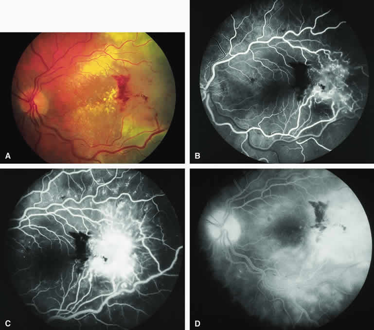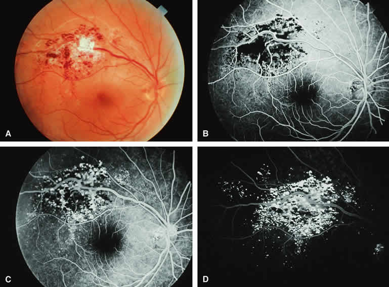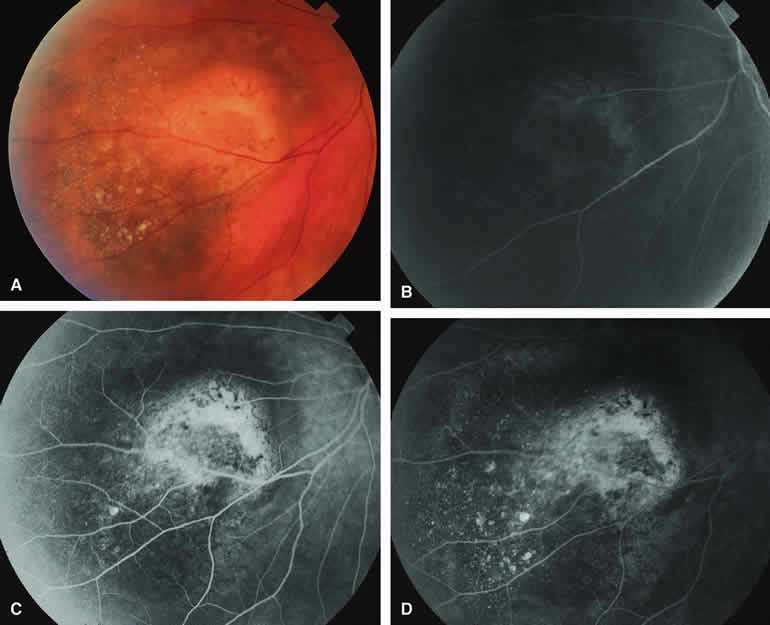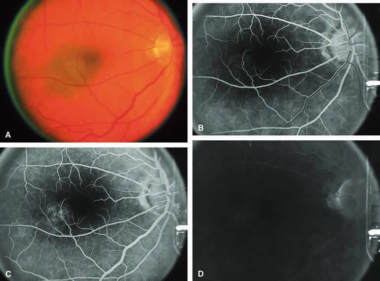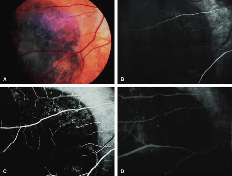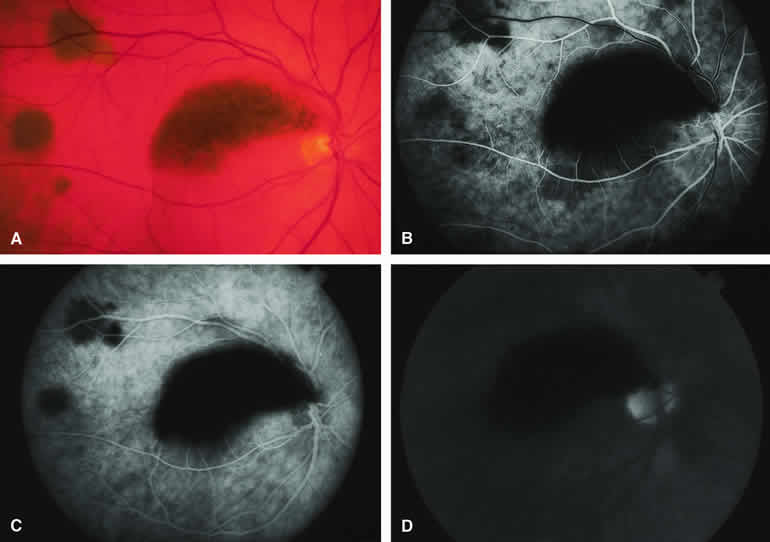 Fluorescence Angiographic Detection of Lesion Enlargement Small melanocytic choroidal lesions in the nevus versus melanoma category are frequently monitored periodically following initial documentation for enlargement or other indicators of possible malignant behavior. Fluorescein angiography sometimes defines the basal area of these lesions better than does fundus photography, but ICG angiography is clearly the preferred technique for this purpose. If one elects to follow a small melanocytic choroidal tumor without treatment, comparative fluorescence angiography can be used to identify slight lesion enlargement that is not clearly evident by ophthalmoscopy or comparison of fundus photographs. Because benign choroidal nevi can and do enlarge, however, detection of subtle lesion enlargement by fluorescence angiography probably has limited differential diagnostic value in these lesions. CHOROIDAL MALIGNANT MELANOMA Choroidal malignant melanoma is the most common primary malignant intraocular neoplasm of adults. It has substantial local growth potential in addition to its well-known propensity to metastasize and, thereby, prove fatal to the host. Fluorescence angiography can provide evidence in support of the diagnosis of choroidal melanoma but is rarely if ever sufficient by itself to establish the diagnosis. Several ophthalmoscopically detectable features of clinically diagnosed melanocytic choroidal tumors are strongly indicative of their malignant potential. These include tumor diameter substantially greater than 7 mm, tumor thickness substantially greater than 3 mm, prominent intralesional large-caliber blood vessels, nodular apical eruption of the tumor through Bruch's membrane, invasion of the overlying retina by the tumor, and a prominent nonrhegmatogenous retinal detachment with shifting subretinal fluid. Several distinct fluorescein and ICG angiographic patterns have been associated with choroidal melanomas.1, 2, 3, 4, 5, 6, 7, 14, 15, 16, 17, 18, 19, 20, 21 These distinct patterns depend on the degree of pigmentation of the tumor cells, the thickness of the tumor, the presence or absence of eruption of tumor through the overlying Bruch's membrane, and the presence or absence of retinal invasion by the tumor. Melanotic Choroidal Melanoma Without Invasive Features The typical choroidal melanoma that has not broken through Bruch's membrane generally appears as a gray-brown to dark brown, dome-shaped, solid choroidal mass (Fig. 9A). The overlying retina commonly appears normal except that it is draped over the choroidal tumor. Fluorescein angiography (see Fig. 9B, C, and D) typically shows the tumor to be relatively hypofluorescent during the early frames of the study. If prominent clumps of orange lipofuscin pigment are present on the surface of the tumor, they will appear intensely hypofluorescent throughout the study because of blockage of the underlying choroidal and tumor vascular fluorescence. During the arterial phase frames of the study, several ill-defined large-caliber deep intralesional blood vessels may be identifiable against the generally hypofluorescent background. As the study continues, these large intralesional blood vessels leak progressively so that the surface of the lesion tends to appear hyperfluorescent by the late frames. Fluorescein may also accumulate in the overlying retina and retinal pigment epithelium as tiny discrete pinpoint foci of intense hyperfluorescence. If serous retinal detachment is present overlying and around the tumor, the fluorescein will leak through the retinal pigment epithelium and accumulate in the subretinal fluid by the late frames. The retinal vascular pattern of the overlying retina commonly appears unremarkable in these cases. If ICG angiography is performed on a similar tumor (Fig. 10), the tumor mass generally appears more intensely hypofluorescent throughout the study and its intrinsic blood vessels appear more clearly visible than on fluorescein angiography. ICG slowly accumulates within the extracellular space of the tumor so that the tumor usually appears mildly hyperfluorescent, at least in part, in the late frames. Amelanotic Choroidal Melanoma Without Invasive Features If the choroidal melanoma being evaluated is relatively amelanotic (Figs. 11A and 12A), its large-caliber intralesional blood vessels will tend to show up more distinctly on both fluorescein angiography (see Fig. 11B, C, and D) and ICG angiography (see Fig. 12B, C, and D) than they would in a darkly melanotic choroidal melanoma. Despite its amelanotic color, the cellular component of the mass tends to be at least mildly hypofluorescent relative to the adjacent uninvolved choroid during the early frames of the study. As with melanotic melanomas, the mass usually appears at least mildly hyperfluorescent in the late-phase frames (see Figs. 11D and 12D). Choroidal Melanoma With Nodular Eruption Through Bruch's Membrane If a choroidal melanoma has erupted through Bruch's membrane (Figs. 13A and 14A), it forms an apical nodule that is generally hypomelanotic and contains many large-caliber blood vessels. Fluorescein angiography of these tumors (see Fig. 13B, C, and D) typically shows hypofluorescence of the base of the lesion during the early frames, relatively rapid filling of the prominent blood vessels in the apical nodule during the venous and recirculation frames, and intense late staining of the apical nodule resulting from progressive fluorescein leakage by the late-phase frames. Similarly, ICG angiography of these tumors (see Fig. 14B, C, and D) also shows relative early hypofluorescence of the tumor base, early filling of prominent intralesional blood vessels within the apical nodule, intense staining of the apical nodule by the recirculation phase frames, and persistent late hyperfluorescence of the mass. Choroidal Melanoma with Retinal Invasion Occasional choroidal melanomas develop darkly melanotic patches of retinal invasion on their surface. These 