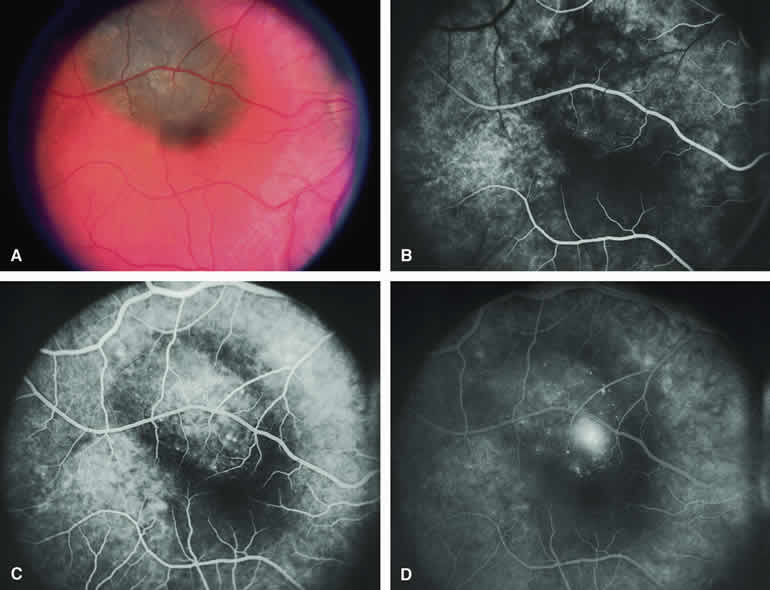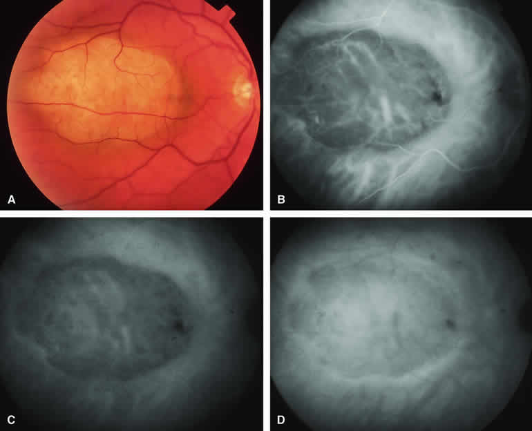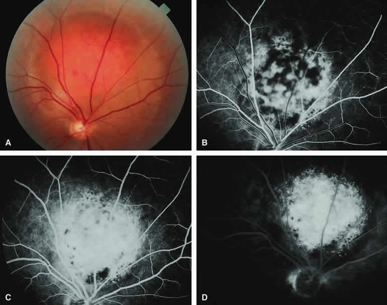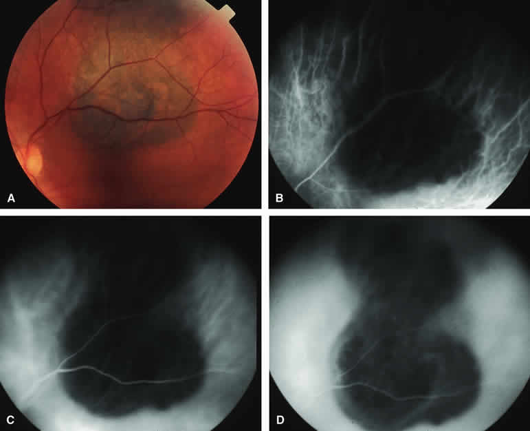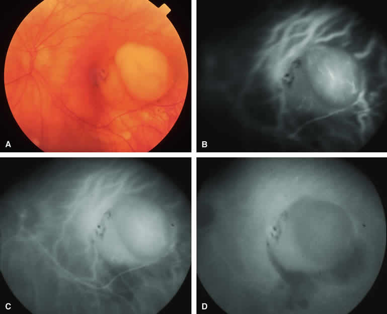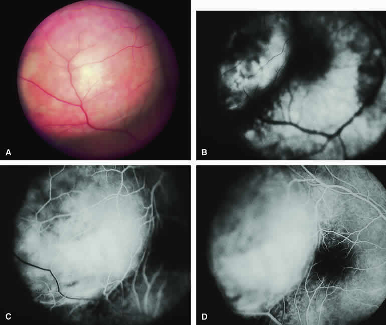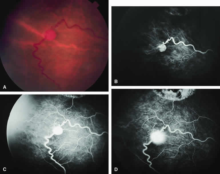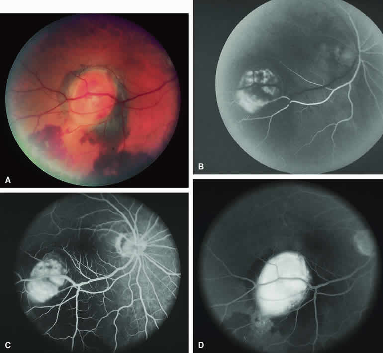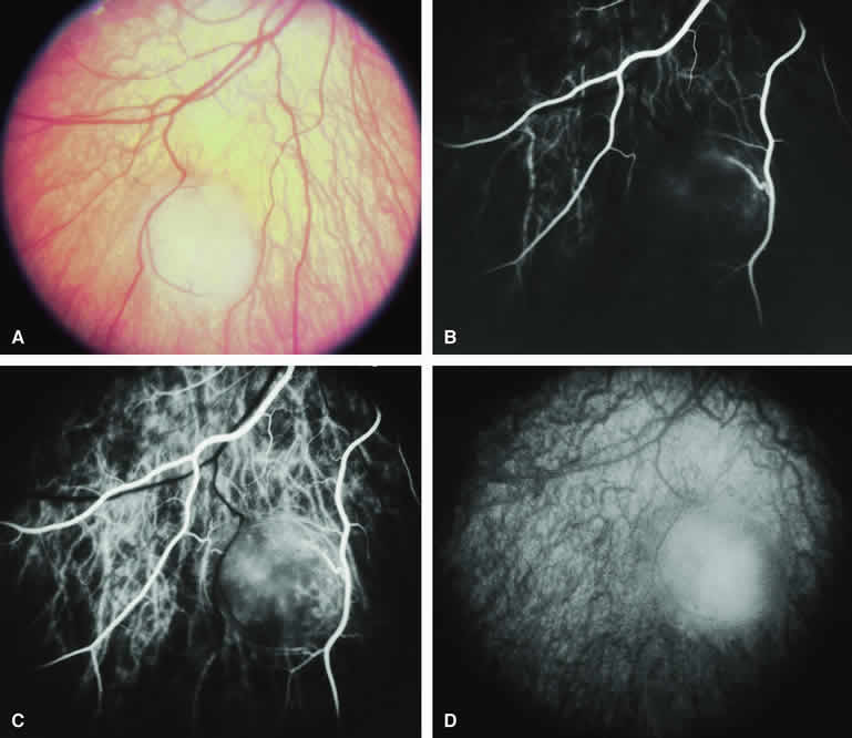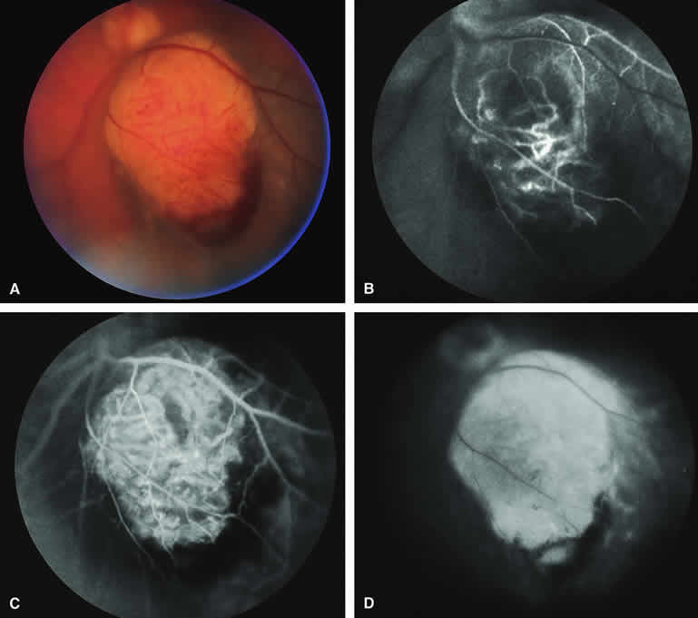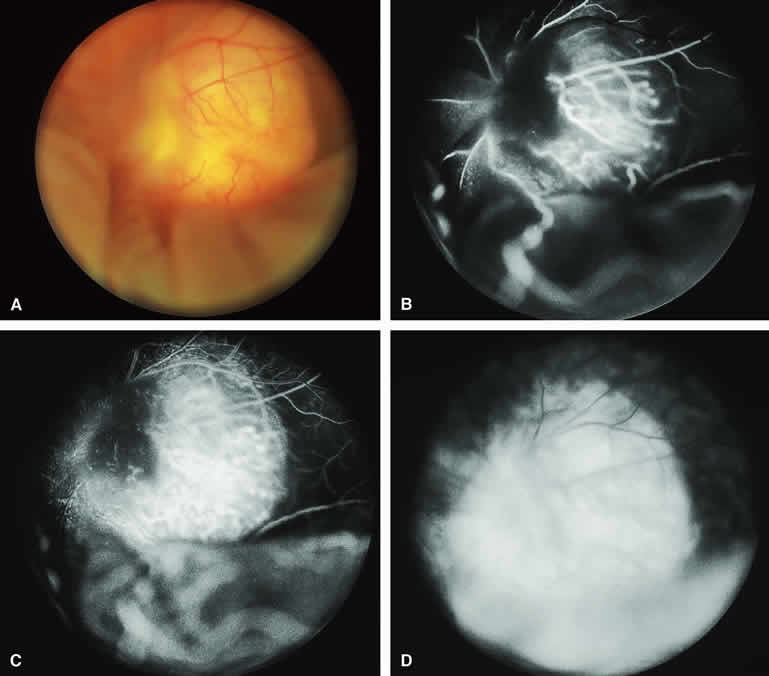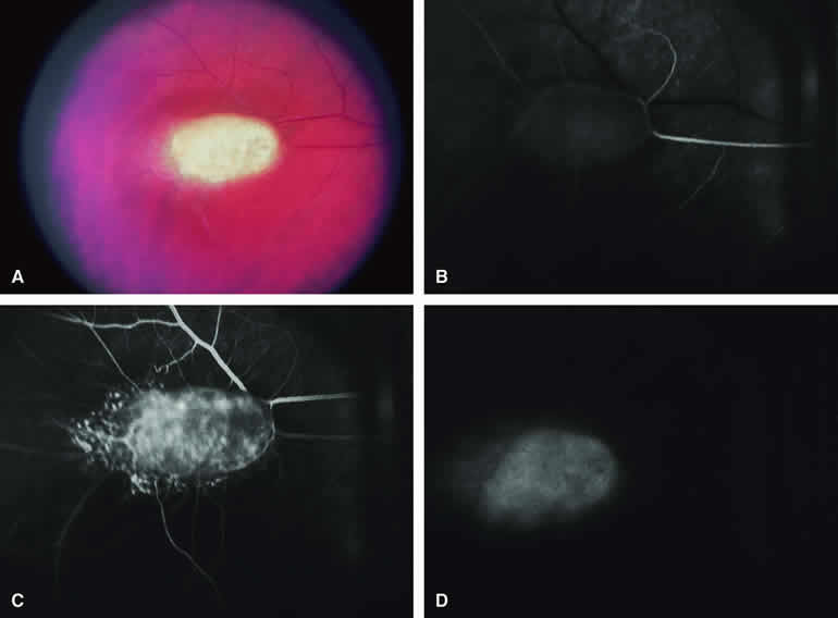 are mentioned in this section. RETINOBLASTOMA Retinoblastoma is the most common primary intraocular malignancy in children. It is usually a unilateral, unifocal, sporadic disease, but a substantial proportion of affected children have multifocal, bilateral, genetic retinoblastoma. A typical discrete retinal tumor in retinoblastoma appears as an opaque white retinal mass with prominent small-caliber surface blood vessels and dilated tortuous afferent and efferent retinal shunt vessels (Figs. 26A and 27A). Unfortunately, most children with retinoblastoma present at a much more advanced intraocular extent of disease, exhibiting leukocoria resulting from the bulk of white tumor filling the vitreous chamber. Because retinoblastoma usually affects young children, fluorescein angiography must be obtained during examination under anesthesia in most cases. Performing a fluorescein angiogram on an intubated infant or small child requires a fundus camera that is mounted vertically on a mobile base or special positioning of the child.32 Fundus fluorescein angiography is rarely, if ever, helpful in the diagnosis of retinoblastoma. If one can visualize the fundus adequately by ophthalmoscopy and can identify discrete white retinal tumors supplied by and drained by retinal blood vessels, fluorescein angiography provides no essential additional information that establishes or refutes the diagnosis of retinoblastoma. The only true solid tumor that strongly resembles retinoblastoma, the retinal astrocytic hamartoma, usually does not have associated dilated and tortuous retinal blood vessels or the degree of surface vascularity that one expects with retinoblastoma. Discrete Intraretinal Retinoblastoma If fluorescein angiography is performed on a discrete intraretinal retinoblastoma (see Figs. 26B, C, and D and 27B, C, and D), the angiogram typically shows rapid filling of the feeding retinal artery, prompt filling of the intralesional capillaries within a second or two, and rapid subsequent filling of the draining retinal vein.32 The intralesional capillaries tend to leak fluorescein, so the tumor characteristically stains brightly in the late frames. However, intraretinal retinoblastoma lesions typically do not show substantial fluorescein leakage into the overlying vitreous. Larger intraretinal retinoblastomas are typically associated with multiple dilated and tortuous feeding retinal arteries and draining retinal veins (Fig. 28A). Fluorescein angiography of this tumor (see Fig. 28B, C, and D) shows rapid filling of the feeding arteries, rapid subsequent filling of intralesional blood vessels, and relatively quick filling of all draining retinal veins. In the later frames, it exhibits intense hyperfluorescent staining. Advanced Intraocular Retinoblastoma Presenting as Leukocoria In cases of total leukocoria in which one cannot discern a distinct tumor, fluorescein angiography documents the visible vascular abnormalities in the detached retrolental retina (exophytic growth pattern) or the absence of vessels in the fluffy retrolental tumor (endophytic growth pattern) but is not otherwise of diagnostic value. Regressed Intraretinal Retinoblastoma Following Radiation Therapy If retinoblastoma is managed by radiation therapy, the tumors commonly regress to calcified (type I) residual nonviable lesions. In some cases, however, a substantial fish flesh (type II) regression pattern accompanies a partially calcific response. Although the entire tumor or portion that exhibits this regression pattern typically appears more grayish and less vascular than untreated viable tumors, this distinction is occasionally difficult to make by ophthalmoscopy. In these situations, fluorescein angiography may be helpful in distinguishing between residual viable tumor and satisfactory type II regression. If the tumor is regressed in a type II pattern, fluorescein angiography typically shows the afferent and efferent retinal vessels to be much less prominent than they were before treatment, the residual intralesional vasculature to be markedly diminished or absent, and late staining to be mild. Regressed Retinoblastoma Following Chemotherapy The first-line management of many children with retinoblastoma today is chemotherapy rather than radiation therapy. Retinoblastomas that have regressed completely following chemotherapy exhibit few if any residual patent intralesional blood vessels and limited late hyperfluorescence. In contrast, retinoblastomas that remain viable and likely to relapse locally tend to have some persistent intralesional blood vessels that can show up prominently on fluorescein angiography. Regressed Retinoblastoma Following Photocoagulation or Laser Therapy Following successful photocoagulation or laser therapy of localized retinoblastoma, the entire treated site should appear flat and atrophic. If there is any question about residual tumor, fluorescein angiography may be helpful. If the lesion is indeed fully regressed, there should be no residual abnormal vasculature within the central portion of the lesion. If even a small amount of residual viable tumor is present, one will often note an irregular vasculature corresponding to that lesion and late staining of that portion. A fluorescein angiogram showing these features is probably an indication for supplemental tumor treatment. RETINAL ASTROCYTIC HAMARTOMA The retinal astrocytic hamartomas is a benign neoplasm derived from intraretinal astrocytes. The typical lesion becomes evident in childhood or early adulthood. This lesion is a frequent feature of tuberous sclerosis, but some patients develop an astrocytic hamartoma of the retina in the absence of other features of this syndrome. Typical Retinal Astrocytic Hamartomas in Tuberous Sclerosis Typical retinal astrocytic hamartomas associated with tuberous sclerosis appear as translucent patches, opalescent spots, or opaque white retinal tumors33,34 (Figs. 29A and 30A). Affected people often have more than one l