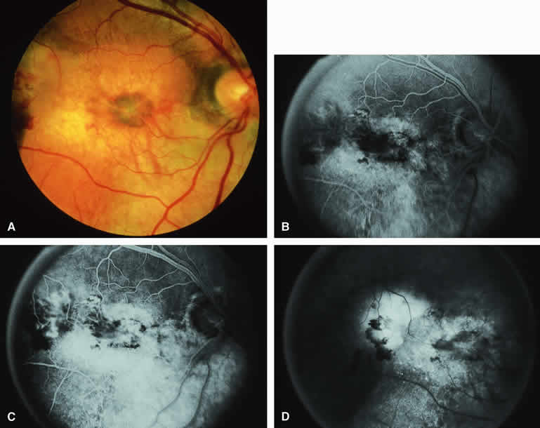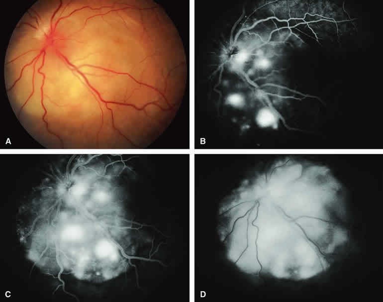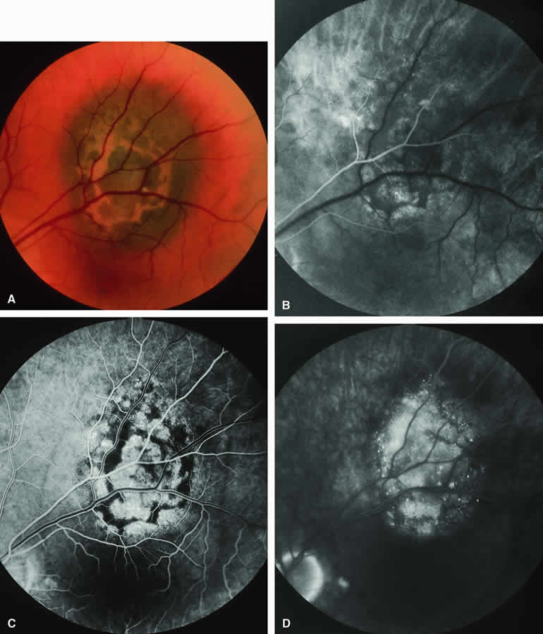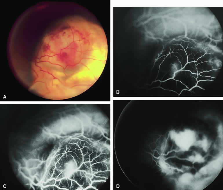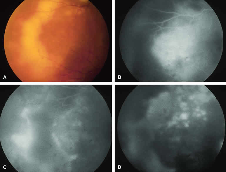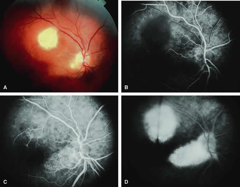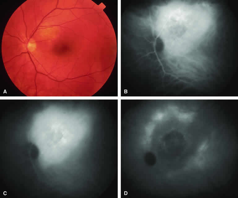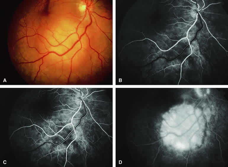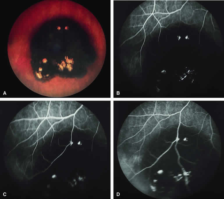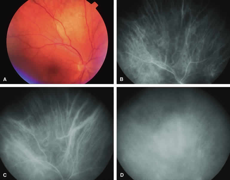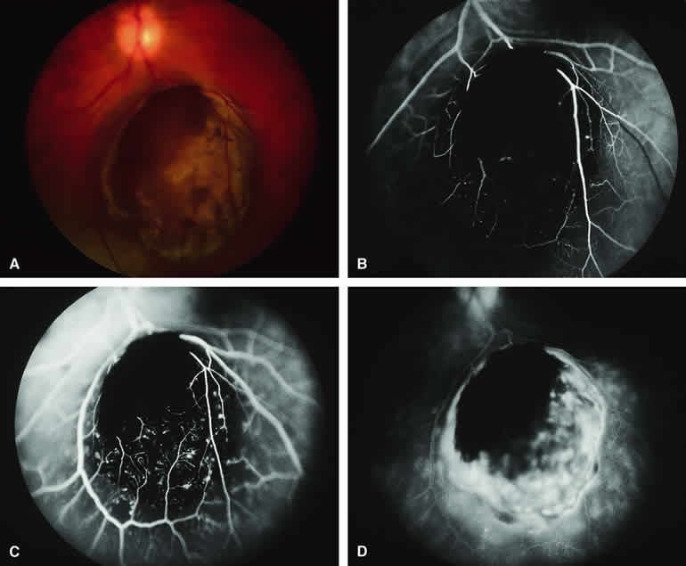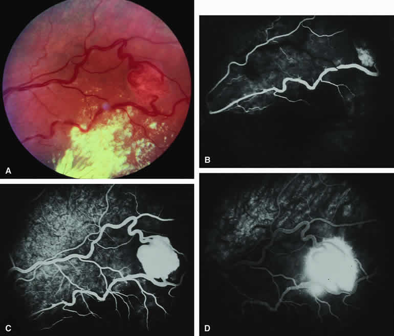 are mentioned in this section. RETINOBLASTOMA Retinoblastoma is the most common primary intraocular malignancy in children. It is usually a unilateral, unifocal, sporadic disease, but a substantial proportion of affected children have multifocal, bilateral, genetic retinoblastoma. A typical discrete retinal tumor in retinoblastoma appears as an opaque white retinal mass with prominent small-caliber surface blood vessels and dilated tortuous afferent and efferent retinal shunt vessels (Figs. 26A and 27A). Unfortunately, most children with retinoblastoma present at a much more advanced intraocular extent of disease, exhibiting leukocoria resulting from the bulk of white tumor filling the vitreous chamber. Because retinoblastoma usually affects young children, fluorescein angiography must be obtained during examination under anesthesia in most cases. Performing a fluorescein angiogram on an intubated infant or small child requires a fundus camera that is mounted vertically on a mobile base or special positioning of the child.32 Fundus fluorescein angiography is rarely, if ever, helpful in the diagnosis of retinoblastoma. If one can visualize the fundus adequately by ophthalmoscopy and can identify discrete white retinal tumors supplied by and drained by retinal blood vessels, fluorescein angiography provides no essential additional information that establishes or refutes the diagnosis of retinoblastoma. The only true solid tumor that strongly resembles retinoblastoma, the retinal astrocytic hamartoma, usually does not have associated dilated and tortuous retinal blood vessels or the degree of surface vascularity that one expects with retinoblastoma. Discrete Intraretinal Retinoblastoma If fluorescein angiography is performed on a discrete intraretinal retinoblastoma (see Figs. 26B, C, and D and 27B, C, and D), the angiogram typically shows rapid filling of the feeding retinal artery, prompt filling of the intralesional capillaries within a second or two, and rapid subsequent filling of the draining retinal vein.32 The intralesional capillaries tend to leak fluorescein, so the tumor characteristically stains brightly in the late frames. However, intraretinal retinoblastoma lesions typically do not show substantial fluorescein leakage into the overlying vitreous. Larger intraretinal retinoblastomas are typically associated with multiple dilated and tortuous feeding retinal arteries and draining retinal veins (Fig. 28A). Fluorescein angiography of this tumor (see Fig. 28B, C, and D) shows rapid filling of the feeding arteries, rapid subsequent filling of intralesional blood vessels, and relatively quick filling of all draining retinal veins. In the later frames, it exhibits intense hyperfluorescent staining. Advanced Intraocular Retinoblastoma Presenting as Leukocoria In cases of total leukocoria in which one cannot discern a distinct tumor, fluorescein angiography documents the visible vascular abnormalities in the detached retrolental retina (exophytic growth pattern) or the absence of vessels in the fluffy retrolental tumor (endophytic growth pattern) but is not otherwise of diagnostic value. Regressed Intraretinal Retinoblastoma Following Radiation Therapy If retinoblastoma is managed by radiation therapy, the tumors commonly regress to calcified (type I) residual nonviable lesions. In some cases, however, a substantial fish flesh (type II) regression pattern accompanies a partially calcific response. Although the entire tumor or portion that exhibits this regression pattern typically appears more grayish and less vascular than untreated viable tumors, this distinction is occasionally difficult to make by ophthalmoscopy. In these situations, fluorescein angiography may be helpful in distinguishing between residual viable tumor and satisfactory type II regression. If the tumor is regressed in a type II pattern, fluorescein angiography typically shows the afferent and efferent retinal vessels to be much less prominent than they were before treatment, the residual intralesional vasculature to be markedly diminished or absent, and late staining to be mild. Regressed Retinoblastoma Following Chemotherapy The first-line management of many children with retinoblastoma today is chemotherapy rather than radiation therapy. Retinoblastomas that have regressed completely following chemotherapy exhibit few if any residual patent intralesional blood vessels and limited late hyperfluorescence. In contrast, retinoblastomas that remain viable and likely to relapse locally tend to have some persistent intralesional blood vessels that can show up prominently on fluorescein angiography. Regressed Retinoblastoma Following Photocoagulation or Laser Therapy Following successful photocoagulation or laser therapy of localized retinoblastoma, the entire treated site should appear flat and atrophic. If there is any question about residual tumor, fluorescein angiography may be helpful. If the lesion is indeed fully regressed, there should be no residual abnormal vasculature within the central portion of the lesion. If even a small amount of residual viable tumor is present, one will often note an irregular vasculature corresponding to that lesion and late staining of that portion. A fluorescein angiogram showing these features is probably an indication for supplemental tumor treatment. RETINAL ASTROCYTIC HAMARTOMA The retinal astrocytic hamartomas is a benign neoplasm derived from intraretinal astrocytes. The typical lesion becomes evident in childhood or early adulthood. This lesion is a frequent feature of tuberous sclerosis, but some patients develop an astrocytic hamartoma of the retina in the absence of other features of this syndrome. Typical Retinal Astrocytic Hamartomas in Tuberous Sclerosis Typical retinal astrocytic hamartomas associated with tuberous sclerosis appear as translucent patches, opalescent spots, or opaque white retinal tumors33,34 (Figs. 29A and 30A). Affected people often have more than one l