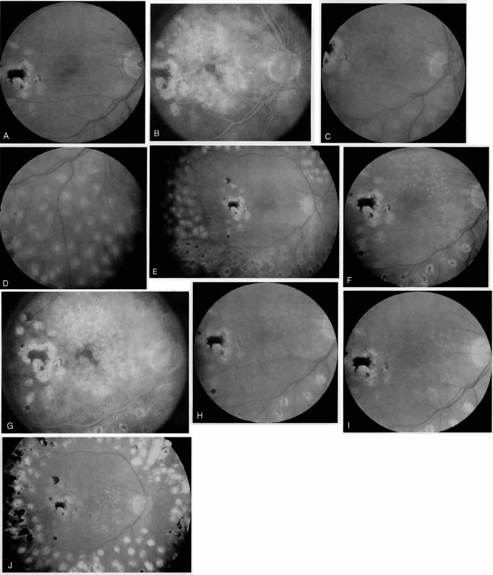 Supplemental macular treatment was required by the ETDRS if macular edema involved or threatened the center of the macula. Supplemental treatment was allowed for any degree of edema, which met one of the definitions for clinical significance.19,22,23 Fluorescein angiography is again useful in guiding the treatment once the clinical need for retreatment has been determined. Supplemental modified grid macular photocoagulation is recommended by Olk if residual central thickening involving the foveal avascular zone is seen on clinical examination.20,21,26 Only if retreatment is being considered does one obtain a fluorescein angiogram to delineate the areas of leakage, to identify the foveal avascular zone, and to guide in the pattern of treatment (Color Plate. 4, Fig. 4). |