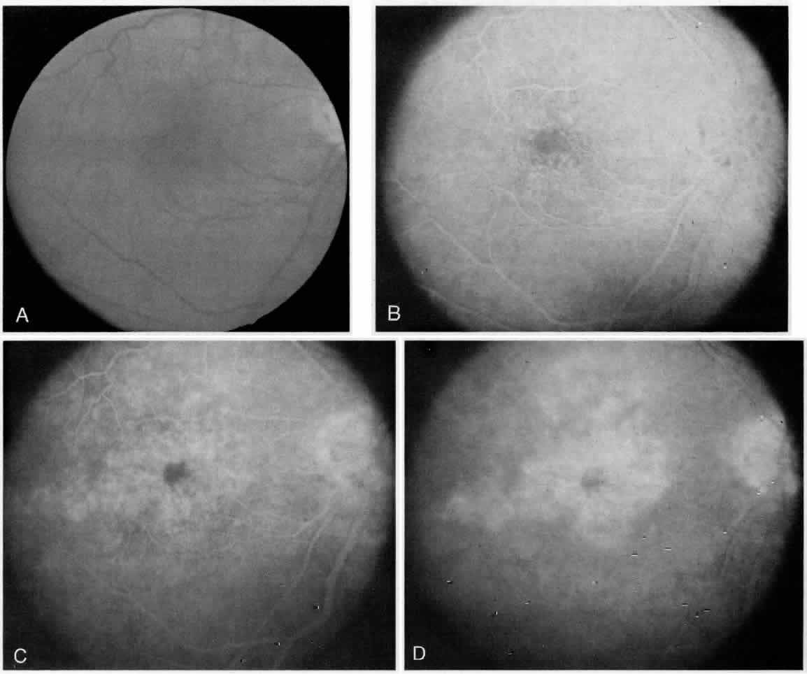 Although the ETDRS showed a treatment benefit at all levels of visual acuity, if an eye has good vision and is asymptomatic, one can elect to follow the patient, rather than treat immediately. That patient should be followed at close intervals at least every 3 months; a fluorescein angiogram is not indicated until the decision to treat has been made based on the clinical examination (Color Plate. 3, Fig. 3).
