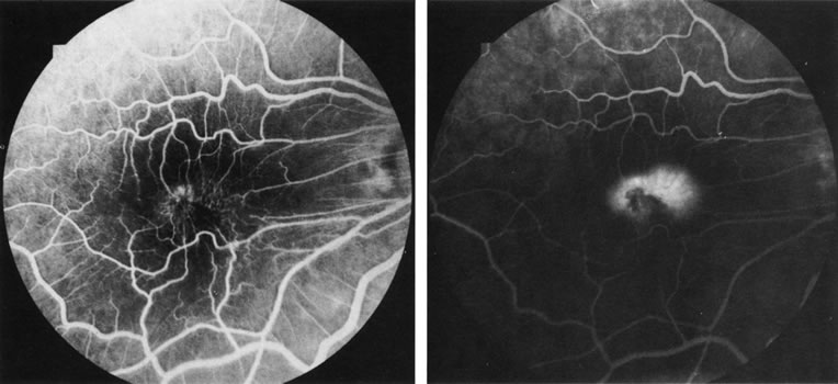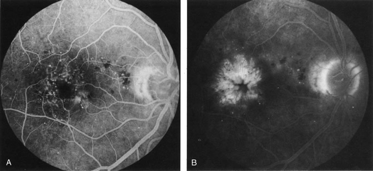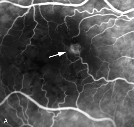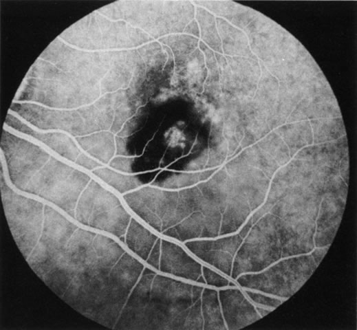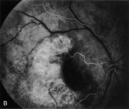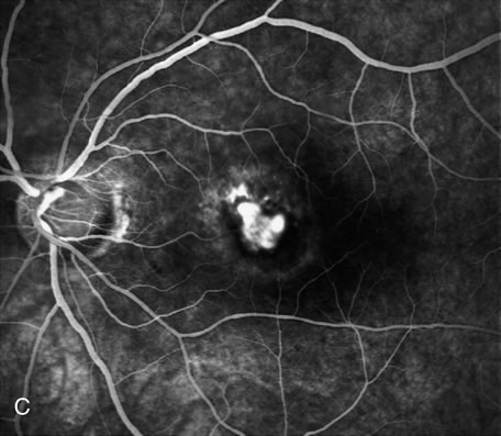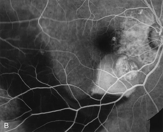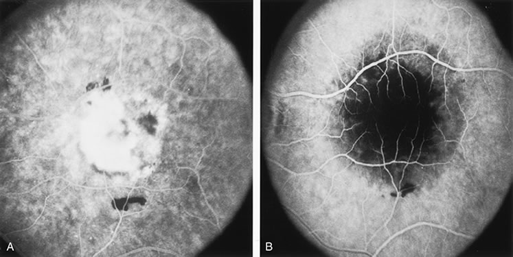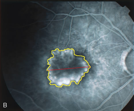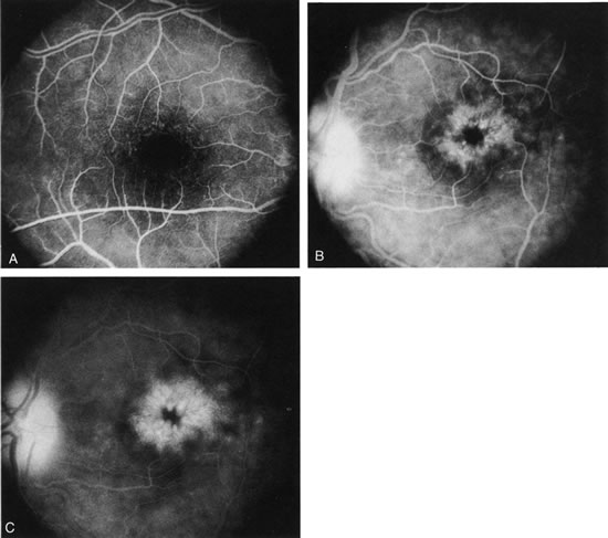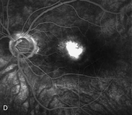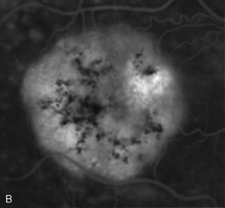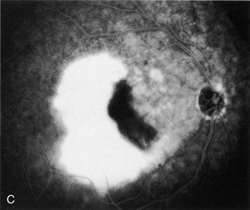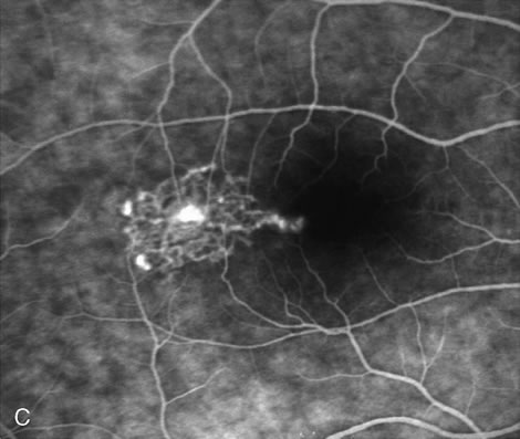 The FA can also distinguish CNV from simulating lesions. For example, a dark mound of blood due to hemorrhage from a CNV will block choroidal fluorescence, whereas vascular tumefactions such as choroidal hemangiomas leak fluorescein. Choroidal melanomas frequently block early choroidal fluorescence and then leak fluorescein from their intrinsic vascular network in later phases of FA. TREATMENT FA is vital for the management of CNV.51–55 It can define the borders of the membrane and help localize the fovea. The final determination whether the CNV is subfoveal, juxtafoveal, or extrafoveal requires use of both FA to outline the membrane with respect to the retinal vasculature and clinical examination to define the precise location of the fovea (Fig. 16). Some patients, particularly those with high myopia, have an indistinct foveal avascular zone on FA. Other FA clues, such as the location of the macula lutea pigment, can be deceptive, because fixation does not necessarily correspond to the center of the macula lutea. The value of FA is also limited in cases of occult or poorly defined CNV, in which the exact location of the leaking CNV vessels cannot be angiographically determined (Fig. 17), and in patients with subretinal hemorrhage that obscures the membrane. In these patients, ICG angiography may be the most precise means of localization.