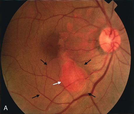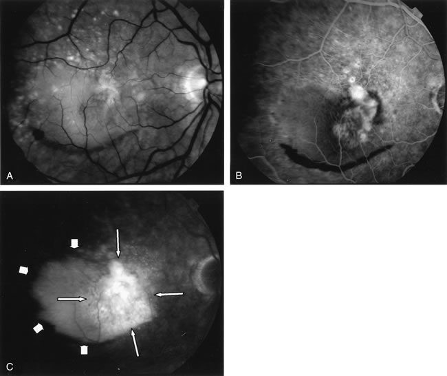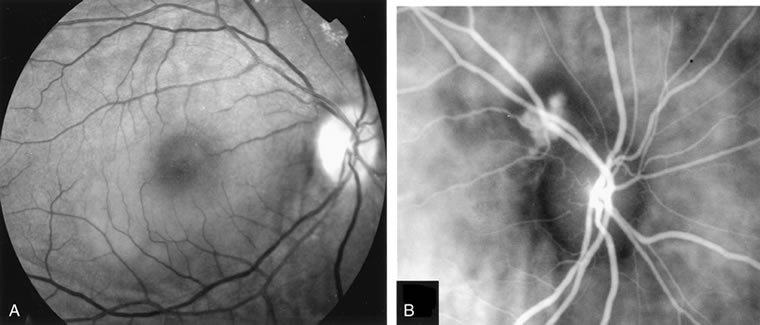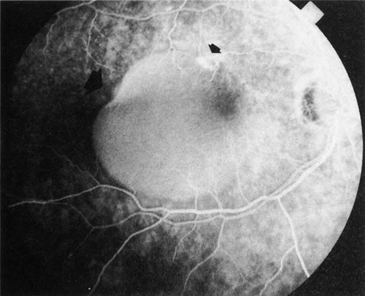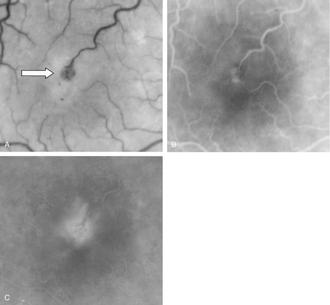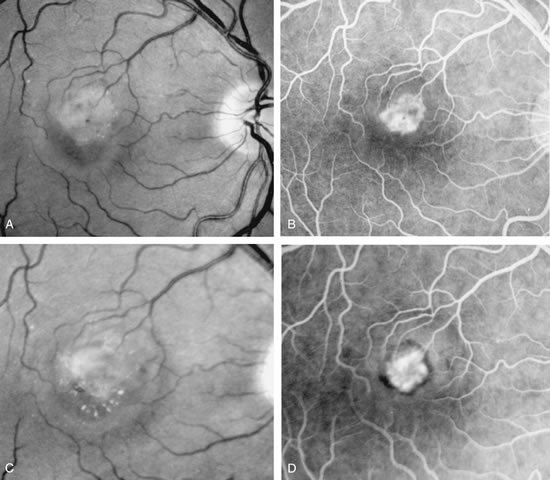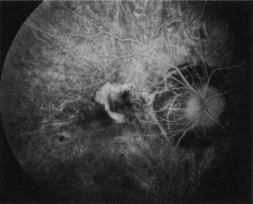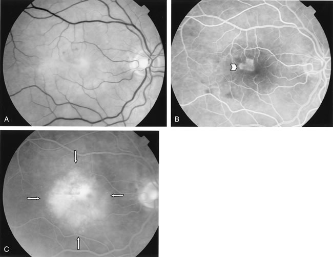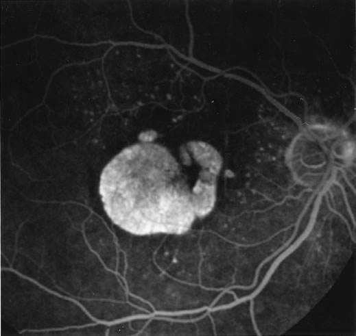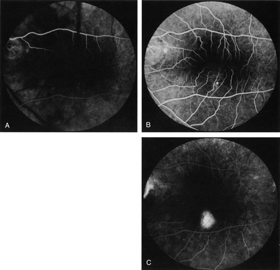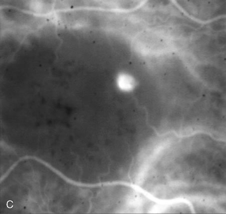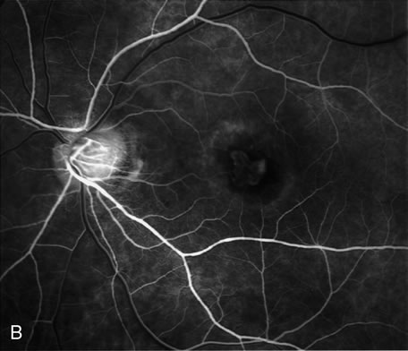 The FA can also distinguish CNV from simulating lesions. For example, a dark mound of blood due to hemorrhage from a CNV will block choroidal fluorescence, whereas vascular tumefactions such as choroidal hemangiomas leak fluorescein. Choroidal melanomas frequently block early choroidal fluorescence and then leak fluorescein from their intrinsic vascular network in later phases of FA. TREATMENT FA is vital for the management of CNV.51–55 It can define the borders of the membrane and help localize the fovea. The final determination whether the CNV is subfoveal, juxtafoveal, or extrafoveal requires use of both FA to outline the membrane with respect to the retinal vasculature and clinical examination to define the precise location of the fovea (Fig. 16). Some patients, particularly those with high myopia, have an indistinct foveal avascular zone on FA. Other FA clues, such as the location of the macula lutea pigment, can be deceptive, because fixation does not necessarily correspond to the center of the macula lutea. The value of FA is also limited in cases of occult or poorly defined CNV, in which the exact location of the leaking CNV vessels cannot be angiographically determined (Fig. 17), and in patients with subretinal hemorrhage that obscures the membrane. In these patients, ICG angiography may be the most precise means of localization.