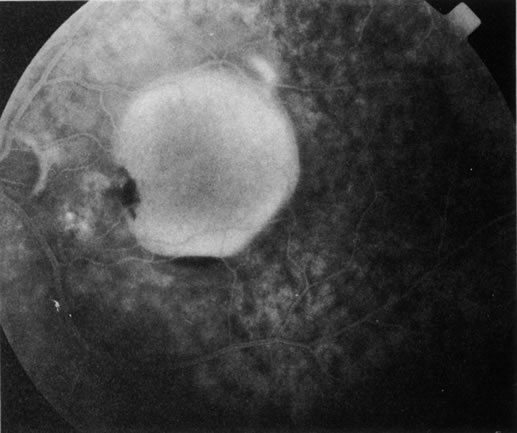 PCV is characterized by the presence of dilated, choroidal vascular channels ending in orange bulging polyp-like dilations in the peripapillary and macular area. Associated features are recurrent subretinal hemorrhage and vitreous hemorrhage, relatively minimal fibrous scarring, absence of retinal vascular disease, pathologic myopia, and signs of intraocular inflammation. FA demonstrates the presence of the dilated vascular channel (Fig. 14 and 15). However, the presence of blood and exudation may block the details of the choroidal circulation on the angiogram. In these cases, ICG angiography can better demonstrate the presence of a distinct network of vessels within the choroid because the larger choroidal vessels are filled with dye.