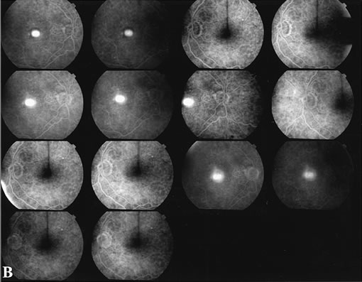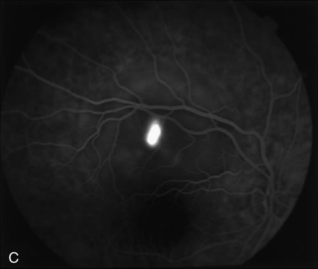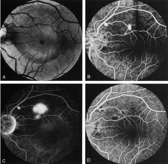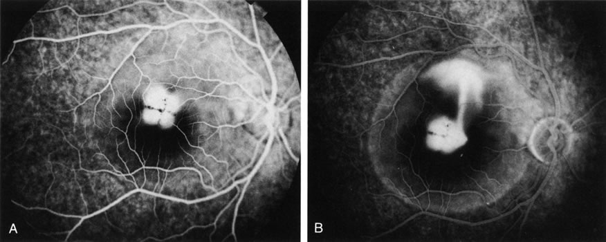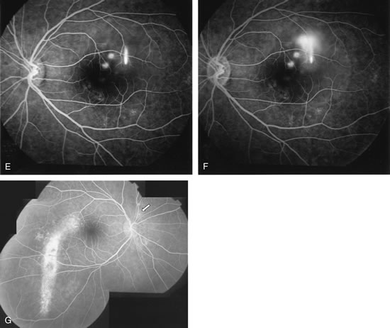 FOLLOW-UP FA is needed to assess response to laser photocoagulation of a CNV and to diagnose recurrent membranes.51,54 The authors generally obtain angiograms 2 weeks, 1 month, 3 months, and 6 months after treatment. The risk of recurrence is greatest during the first 3 months, and the patient, who often has decreased vision due to prior neurosensory detachment, may be asymptomatic. FA is also needed to evaluate the results of PDT. In the original protocol of the Verteporfin in Photodynamic Therapy (VIP) and Treatment of Age-Related Macular Degeneration with Photodynamic Therapy (TAP) studies, a fluorescein angiogram was obtained every 3 months, and if there was persistent leakage from the CNV PDT was applied again (see Fig. 18–20).60 |
