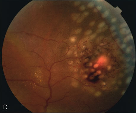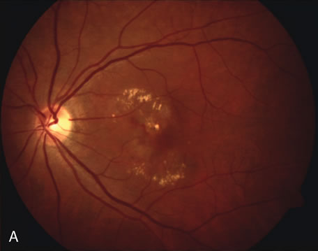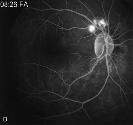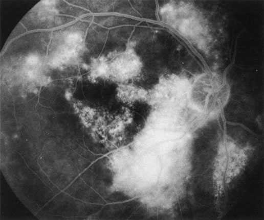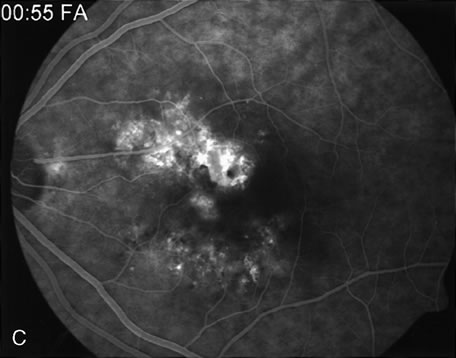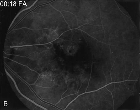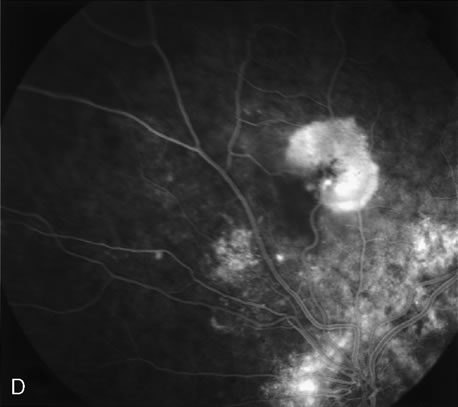 Conventional laser thermophotocoagulation is the treatment of choice for extrafoveal, well-defined, classic CNV. Photodynamic treatment (PDT) is the treatment of choice for subfoveal, predominantly classic CNV. FA is used to localize the lesion in relation to the fovea, classify the subtype, choose the type of procedure, and guide the treatment (Figs. 18, 19, and 20).56–73
