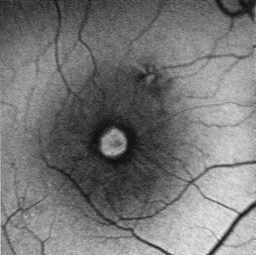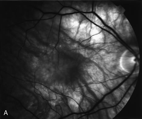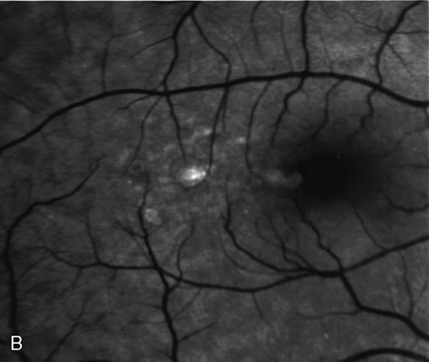 There are several causes of pseudoholes, including an area of sharply demarcated RPE atrophy, a dilated perifoveal capillary net, and an ERM with a clear center. Careful contact lens biomicroscopic examination will usually distinguish these conditions from a full-thickness macular hole, but FA can help. Both RPE atrophy and a full-thickness hole will exhibit window defects, but RPE atrophy tends to have more residual pigment and consequently a more mottled appearance of the transmitted choroidal fluorescence. A dilated perifoveal capillary net, which can be seen in diabetes or perifoveal telangiectasia, will leak fluorescein. A pseudohole will not have a window defect. OCT examination is the most accurate test for differentiating full-thickness macular holes, lamellar holes, and pseudoholes.215–230 Autofluorescence imaging, a novel technique for diagnosis of macular holes, is based on the principle that the autofluorescence signal from the RPE is not blocked by the retinal pigments in the presence of a full-thickness macular hole; as a result, a full-thickness macular hole presents a bright autofluorescent signal, whereas pseudoholes and lamellar holes are not autofluorescent (Fig. 35). This technique has the advantage, compared with FA, of not requiring dye injection.