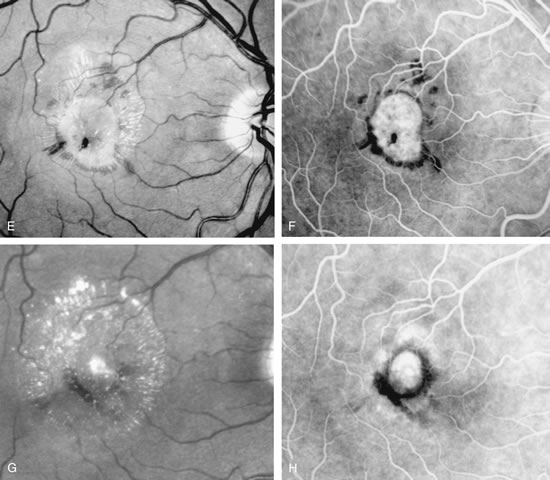 TREATMENT The value of treating CNV in highly myopic patients is controversial. The CNV generally does not grow extensively, there is considerable risk of rupturing Bruch's membrane, and the laser burn chorioretinal scar tends to enlarge substantially.251,252 Nevertheless, there is evidence that patients with pathologic myopia who receive treatment for CNV have better final visual acuity.243 FA often helps define the extent of CNV, but it has limited value in assisting the localization of the fovea. PDT has proved to be a useful option for the treatment of subfoveal CNV in myopia.256 FOLLOW-UP FA is useful in evaluating the efficacy of treatment of CNV and in determining whether recurrent CNV has developed. Patients with subfoveal CNV are likely to lose central vision. The diagnosis and prognosis of atrophic myopic degeneration is best determined by clinical appearance. |
