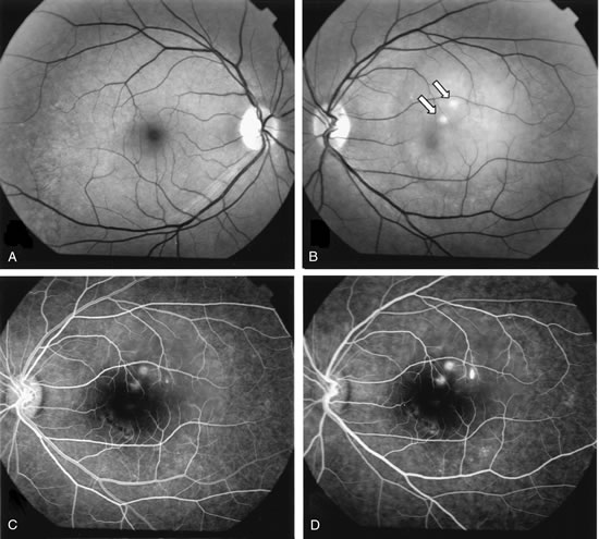 1. Schatz H: Fluorescein angiography: Basic principles and interpretation. In Ryan SJ (ed): Retina, Vol 2. Medical Retina, pp 3–80. St. Louis, CV Mosby, 1989 2. Richard G: Fluorescein Angiography: Textbook and Atlas. New York, Thieme Medical Publishers, 1990. 3. Green WR, McDonnell PJ, Yeo JH: Pathologic features of senile macular degeneration. Ophthalmology 92:615, 1985. 4. Elman MJ, Fine SL, Murphy RP et al: The natural history of serous retinal pigment epithelium detachment in patients with age-related macular degeneration. Ophthalmology 93:224, 1986. 5. Folk JC: Aging macular degeneration: Clinical features of treatable disease. Ophthalmology 92:594, 1985. 6. Bressler NM, Bressler SB, Gragoudas ES: Clinical characteristics of choroidal neovascular membranes. Arch Ophthalmol 105:209, 1987. 7. Bressler SB, Bressler NM, Fine SL et al: Natural course of choroidal neovascular membranes within the foveal avascular zone in senile macular degeneration. Am J Ophthalmol 93:157, 1982. 8. Yannuzzi LA, Negrão S, Iida T et al: Retinal angiomatous proliferation in age-related macular degeneration. Retina 21:416–434, 2001. 9. Fernandez LH, Freund KB, Yannuzzi LA et al: The nature of focal areas of hyperfluorescence or hot spots imaged with indocyanine green angiography. Retina 22:557–568, 2002. 10. Ghazi NG. Retinal angiomatous proliferation in age-related macular degeneration. Retina 22:509–511, 2002. 11. Axer-Siegel R, Bourla D, Priel E et al: Angiographic and flow patterns of retinal choroidal anastomoses in age-related macular degeneration with occult choroidal neovascularization. Ophthalmology 109:1726–1736, 2002. 12. Lafaut BA, Aisenbrey S, Vanden Broecke C et al: Clinicopathological correlation of deep retinal vascular anomalous complex in age related macular degeneration. Br J Ophthalmol 84:1269–1274, 2000. 13. Slakter JS, Yannuzzi LA, Schneider U: Retinal choroidal anastomoses and occult choroidal neovascularization in age-related macular degeneration. Ophthalmology 107:742–753, 2000. 14. Hartnett ME, Weiter JJ, Staurenghi G et al: Deep retinal vascular anomalous complexes in advanced age-related macular degeneration. Ophthalmology. 103:2042–2053, 1996. 15. Kuhn D, Meunier I, Soubrane G et al: Imaging of chorioretinal anastomoses in vascularized retinal pigment epithelium detachments. Arch Ophthalmol 113:1392–1398, 1995. 16. Schneider U, Gelisken F, Kreissig I: Retinal choroidal anastomosis in classic choroidal neovascularization demonstrated by indocyanine green angiography. Acta Ophthalmol Scand 73:450–452, 1995. 17. Yannuzzi LA, Ciardella A, Spaide RF et al: The expanding clinical spectrum of idiopathic polypoidal choroidal vasculopathy. Arch Ophthalmol 115:478–485, 1997. 18. Yannuzzi LA, Freund KB, Goldbaum M et al: Polypoidal choroidal vasculopathy masquerading as central serous chorioretinopathy. Ophthalmology 107:767–777, 2000. 19. Yannuzzi LA, Noguiera FB, Spaide RF et al: Idiopathic Polypoidal choroidal vasculopathy: A peripheral lesion. Arch Ophthalmol 116:382–383, 1998. 20. Yannuzzi LA, Sorenson J, Spaide RF et al: Idiopathic polypoidal choroidal vasculopathy. Retina 10:1–8, 1990. 21. Yannuzzi LA, Wong DW, Sforzolini BS et al: Polypoidal choroidal vasculopathy and neovascularized age-related macular degeneration. Arch Ophthalmol 117:1503–1510, 1999. 22. Spaide RF, Yannuzzi LA, Slakter JS et al: Indocyanine green videoangiography of idiopathic polypoidal choroidal vasculopathy. Retina 15:100–110, 1995. 23. Kleiner RC, Bruckner AJ, Johnson RL: Posterior uveal bleeding syndrome. Ophthalmology 91:110, 1984. 24. Stern RM, Zakov N, Zegarra H et al: Multiple recurrent serous sanguineous retinal pigment epithelial detachments in black women. Am J Ophthalmol 100:560–569, 1985. 25. Kleiner RC, Bruckner AJ, Johnson RL: The posterior uveal bleeding syndrome. Retina 10:9–17, 1990. 26. Perkovich BT, Zakov N, Berlin LA et al: An update on multiple recurrent serosanguineous retinal pigment epithelial detachments in black women. Retina 10:18–26, 1990. 27. MacCumber MW, Dastgheib K, Bressler NM et al: Clinicopathological correlation of the multiple recurrent serosanguineous retinal pigment epithelial detachment syndrome. Retina 15:11–110, 1995. 28. Auhja RM, Stanga PE, Vingerling JR et al: Polypoidal choroidal vasculopathy in exudative and hemorrhagic pigment epithelial detachments. Br J Ophthalmol 84:479–484, 2000. 29. Escano MF, Fujii S, Ishibashi K et al: Indocyanine green videoangiography in macular variant of idiopathic polypoidal choroidal vasculopathy. Jap J Ophthalmol 44:313–316, 2000. 30. Uyama M, Wada M, Nagai Y et al: Polypoidal choroidal vasculopathy: Natural history. Am J Ophthalmol 133:639–648, 2002. 31. Uyama M, Matsubara T, Fukushima I et al: Idiopathic polypoidal choroidal vasculopathy in Japanese patients. Arch Ophthalmol 117:1035–1042, 1999. 32. Kwok AKH, Lai TYY, Chan CWN et al: Polypoidal choroidal vasculopathy in Chinese patients. Br J Ophthalmol 86:892–897, 2002. 33. Lafaut BA, Aisenbrey S, van den Broecke C et al: Polypoidal choroidal vasculopathy pattern in age-related macular degeneration. Retina 20:650–654, 2000. 34. Lafaut BA, Leyes AM, Snyers B et al: Polypoidal choroidal vasculopathy in Caucasians. Graefes Arch Clin Exp Ophthalmol 238:752–759, 2000. 35. Lip PL, Hope-Ross MW, Gibson JM: Idiopathic polypoidal choroidal vasculopathy: A disease with diverse clinical spectrum and systemic associations. Eye 5:695–700, 2000. 36. Lois N: Idiopathic polypoidal choroidal vasculopathy in a patient with atrophic age-related macular degeneration. Br J Ophthalmol 85:1011–1012, 2001. 37. Moorthy RS, Lyon AT, Rabb MF et al: Idiopathic polypoidal choroidal vasculopathy of the macula. Ophthalmology 105:1380–1385, 1998. 38. Rosa RH Jr, Davis JL, Eifrig CW: Clinicopathologic correlation of idiopathic polypoidal choroidal vasculopathy. Arch Ophthalmol 120:502–508, 2002. 39. Ross RD, Gitter KA, Cohen C et al: Idiopathic polypoi