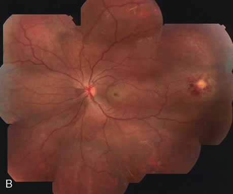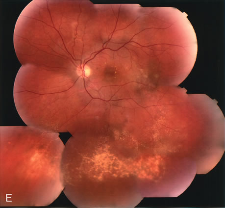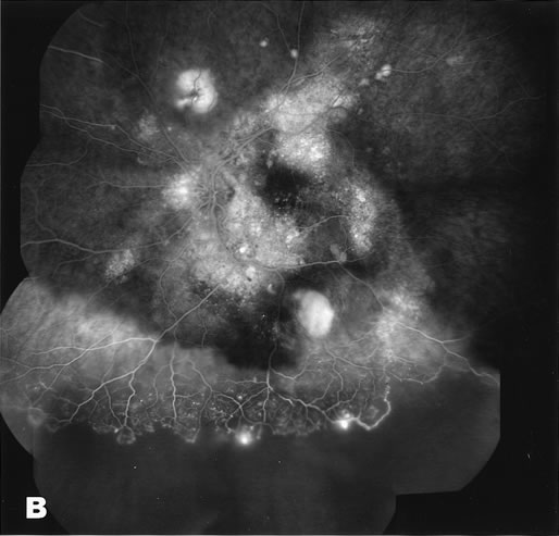 TREATMENT FA can define the locations of CNV in patients with choroidal rupture, which may be amenable to laser therapy. FOLLOW-UP Most trauma-related conditions are followed clinically with serial evaluations of clinical appearance and visual acuity. Routine FA to follow trauma-related maculopathies is not necessary. Patients with choroidal rupture through the fovea, which is generally obvious clinically, lose central vision. In retinal contusion, a normal fluorescein angiogram indicates a good visual prognosis, wherease fluorescein leakage is associated with tissue damage, and nonperfusion carries a poor visual prognosis.257 The outcome of Purtscher's retinopathy and of RPE contusion largely depends on the location of macular involvement. Patients who suffer a macular hole are usually left with approximately 20/400 (6/120) vision. |