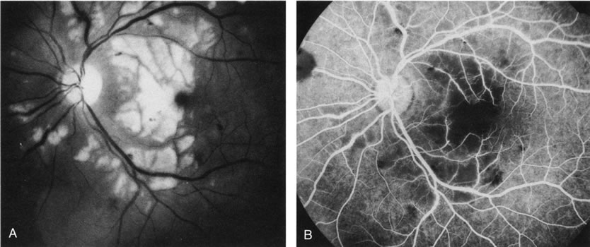Gentamicin and tobramicin toxicity, which often result from inadvertent injection into the vitreous during cataract surgery, cause devastating retinal damage. In areas where high concentrations of gentamicin reach the retina there is obliteration of the retinal vasculature and ischemic necrosis of the retina (Fig. 43).269,270