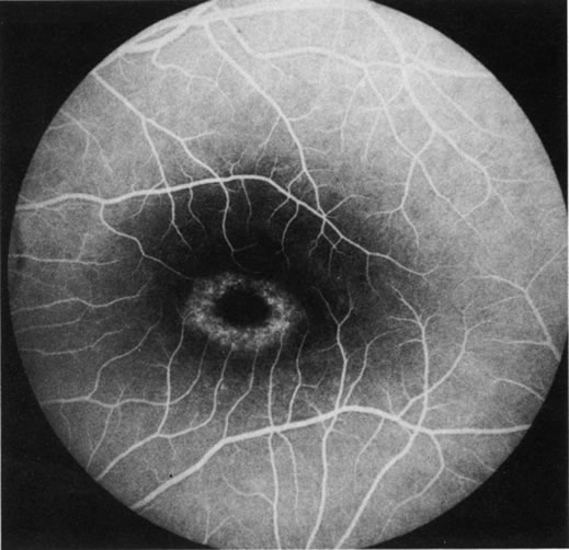 Oxalosis, which results from calcium oxalate deposition, can be due to an inborn metabolic disorder (primarily hyperoxaluria), ethylene glycol ingestion, or methoxyflurane general anesthesia.262–264 Clinically, patients have a crystalline retinopathy, and FA may show RPE hyperplasia, fibrous metaplasia, and choroidal neovascularization.55 Epinephrine induces CME that is generally diagnosed on clinical grounds. This condition occurs more commonly in aphakic patients. The maculopathy typically resolves with cessation of the drug, and FA can be useful to document resolution of the edema. Epinephrine-induced CME evidently increases retinal capillary permeability, but the pathophysiology of this process is poorly understood.265 Tamoxifen, an antiestrogen drug used in some cases of breast cancer, has a characteristic clinical picture.266 FA may reveal Tamoxifen-induced CME from capillary hyperpermeability and RPE alterations. Clofazimine is an antimycobacterial agent that has been used since 1962 to treat dapsone-resistant leprosy and, more recently, to treat Mycobacterium avium-intracellulare complex infection in patients with acquired immunodeficiency syndrome (AIDS). There have been two reports of bull's eye maculopathy with multiple RPE defects demonstrated on FA (Fig. 42).267,268