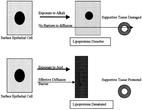 of injury. Disruption of cell membranes may be either physical or biochemical. The cell membranes of all cells are composed of phospholipids. The phospholipid membrane is the interface at which the cells responds to and influences its environment. Phospholipids are soluble at alkaline pH. Alkali injuries are particularly destructive because alkali dissolves all cell membranes with which it comes in contact. Once the surface cells have been destroyed, alkali is free to diffuse deeper into the tissue, where it can lyse both surface and vascular endothelial cells (Fig. 2). Involvement of vascular endothelial cells compounds the injury by adding downstream ischemia. Diffusion continues until the pH is neutralized. Acid injuries are usually more limited because acid causes denaturation and precipitation of cellular proteins. A diffusion barrier is thus created to limit damage to deeper tissues. (see Fig. 2) Mechanical trauma may be focused, as occurs from a concentrated application of pressure (e.g., a steel knife cutting through tissue) or unfocused, as occurs from blunt trauma. Cell death is present on both sides of even the sharpest knife wound because of the transection of cell processes. The death of corneal keratocytes, which have extensively arborizing cellular processes, may extend several microns on either side of a corneal incision. Corneal opacification occurs in the area normally maintained by damaged or dead keratocytes. Blunt trauma may cause simultaneous injury to cells in a large area, as occurs with a corneal abrasion; it may also deform large segments of tissue. The vulnerability of specific ocular tissues varies greatly (Table 2). Elastic tissue, such as Descemet's membrane, the crystalline lens capsule, the zonular fibers of the lens, and Bruch's membrane have a limited range of deformability; beyond it they will rupture. Tightly adherent structures, such as the iris root and the longitudinal ciliary muscle inserted into the scleral spur, concentrate pressure and may also rupture. Transparent structures, such as the cornea, crystalline lens, and retina must maintain homogeneity to maintain transparency. Trauma frequently results in dyshomogeneity sufficient to cause opacification. When hydrostatic pressure is increased suddenly, pressure is transmitted throughout the globe, seeking sites of relative weakness. These sites include the sclera at the limbus, which is relatively thin to accommodate the structures of the trabecular meshwork; the point of insertion of the rectus muscles, and the optic disc (see Table 2).