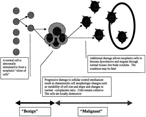 In both instances, excess cells are a threat because they occupy extra space, and tumor cells that lose intracellular cohesiveness are able to spread through adjacent normal tissue and even to distant sites. In retinoblastoma, tumor cells migrate posteriorly along the optic nerve toward the brain, similar to the migration of axons from retinal ganglion cells to the lateral geniculate during normal embryonic development. The migrating cell mass destroys the normal tissue it encounters, leading to organ dysfunction and death. Melanoma uses a different route of egress. Malignant melanoma cells are able to breech blood vessel walls and enter the bloodstream. Neoplastic cells acquire unusual adhesive properties that allow them to congregate in specific distant body sites, such as the liver and lymph nodes that are locally destructive to the host organ. Tumor cells may also produce protein signals (e.g., tumor necrosis factor, which causes systemic abnormalities such as anorexia and weight loss). |